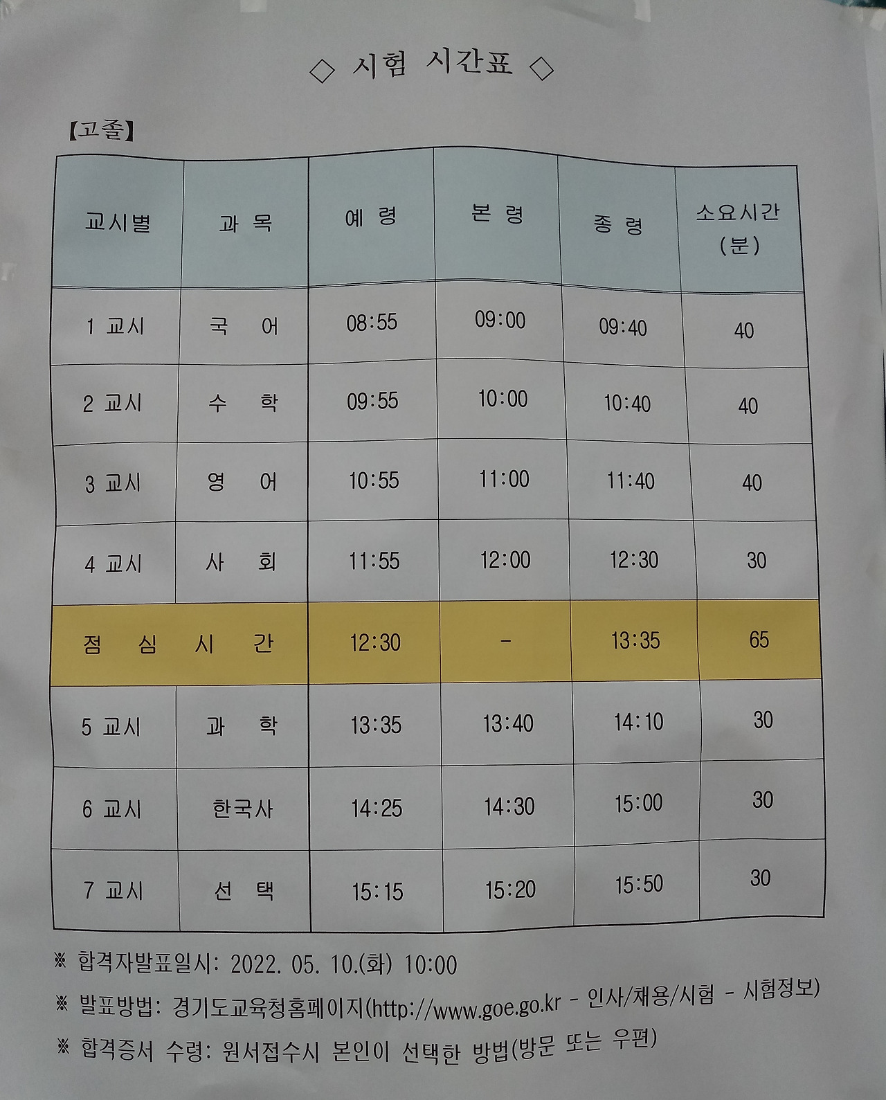검정고시 원서를 넣을 때 필요한 것 중 하나, 공인인증서가 꼭 있어야 합니다. (아이가 미성년자일 때는 발급받는데 필요한 서류가 어마무시 합니다.) 그리고 점심은 밖에 나가서 먹어도 된다는 것. 수험장 정문 출입이 자유롭다는 것 참고하세요.