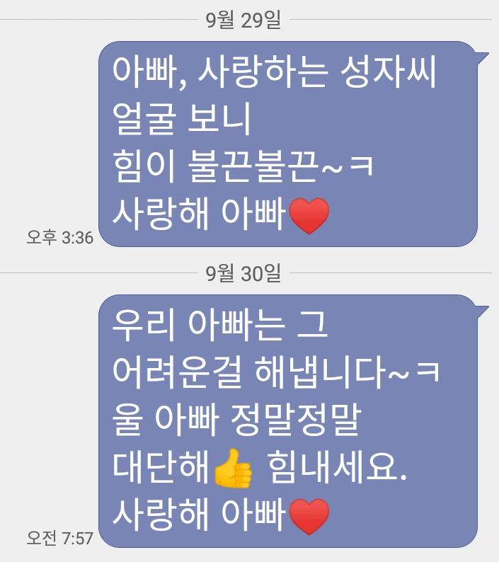 아빠는 아산에서 천안 순천향대학까지 매일 방사선 치료를 받으러 다니셨고 다시 항암치료를 위해 9월 25일 두 번째 입원을 하셨다. 22시간짜리 항암치료를 다섯 번 연달아 받았는데, 마지막 날인 금요일 저녁에는 '아빠, 너무 힘들다'는 말씀을 하셔서 또 속으로 울음을 삼키며 '사랑해 아빠, 힘내세요'라고 웃으며 말했다.