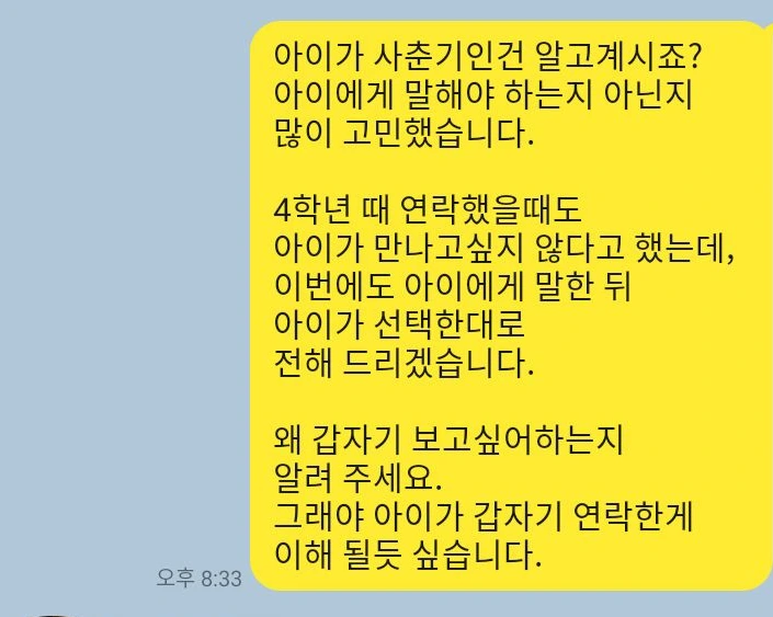 10년간 아무 연락 없다가 이제 와서 왜? 연세가 있으시니 아프신가 본데 마지막으로 아이 얼굴 보고 싶은가 보지?