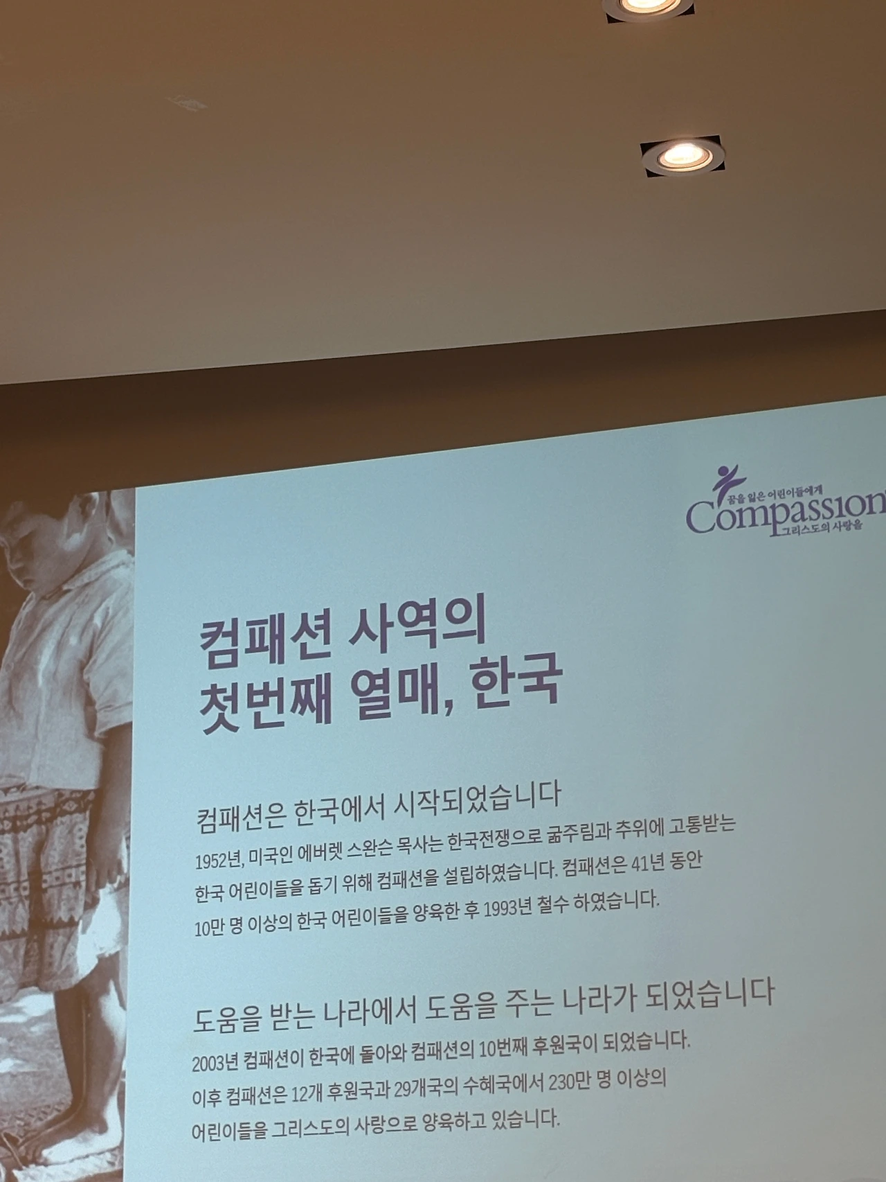 한국은 전쟁 이후 컴패션의 도움을 받던 수혜국이었다. 하지만 지금은 도움을 받던 나라에서 도움을 주는 나라로 변화한 유일한 나라가 되었다.