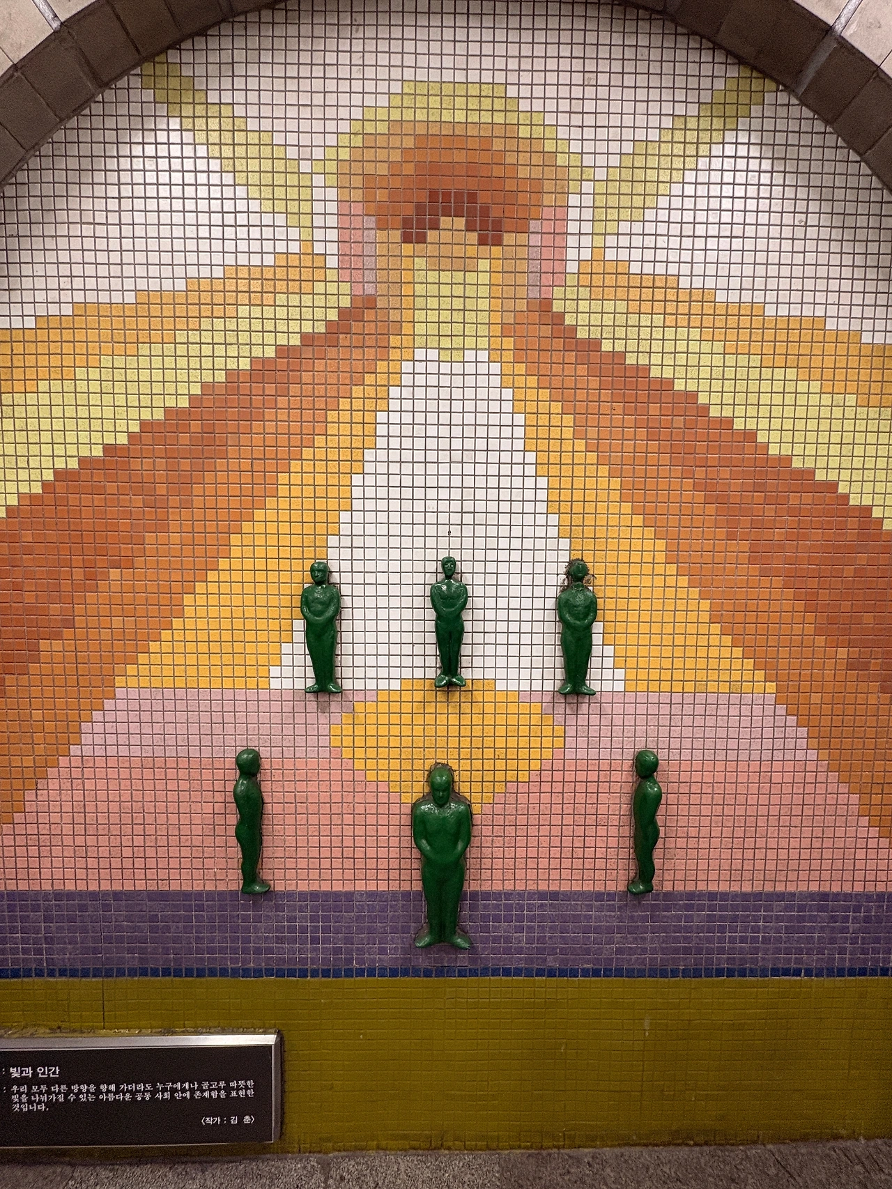 동대문역에 내리기는 거의 처음인 것 같다 눈에 띄는 작품이 있었다. 영화 터미널에서 톰행크스가 공항 쉼터에 만든 타일 작품이 떠올랐다. 그리고 오래된 것 같은 모습에 언제부터 있던 작품일까 궁금해졌다. 검색해도 작가와 작품에 대해서는 나오지 않았다. 대신 이런 작품을 공공미술이라 한다는 걸 알게 됐다. 그동안은 관심이 없었기 때문에 마치 처음 알게 된 사실처럼 느껴진다.