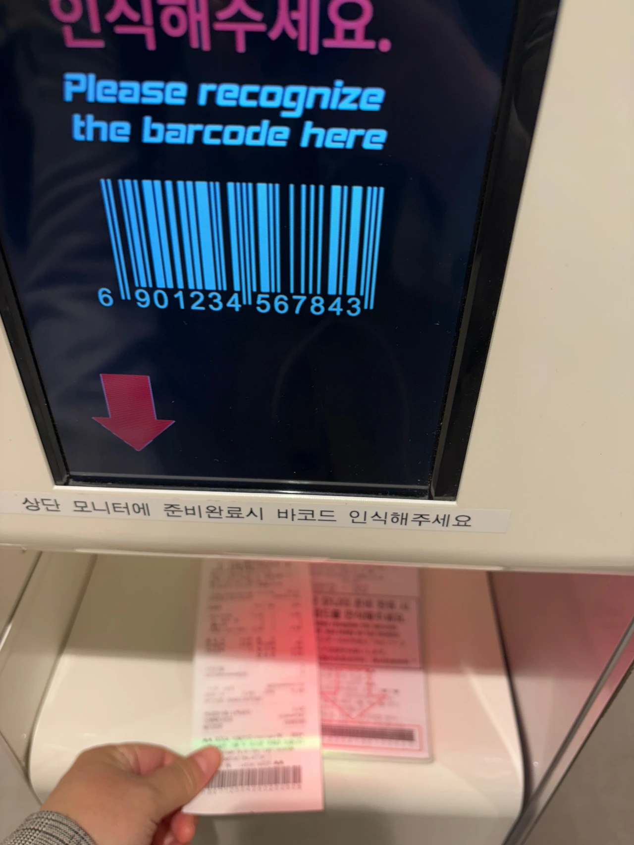 그전에 먼저 소개하고 싶은 게 있다. 포럼에 참석하러 가는 길에 배가 고파 롯데리아 홍대점에 갔다. 여기는 키오스크로 주문을 하고 영수증이 나오는데 내 차례가 되었을 때 사진처럼 바코드를 찍으면 햄버거가 나오는 칸의 번호를 알려준다.