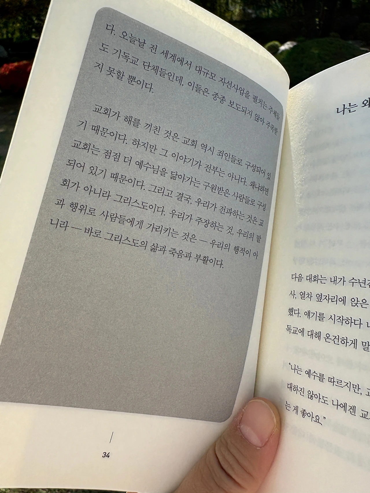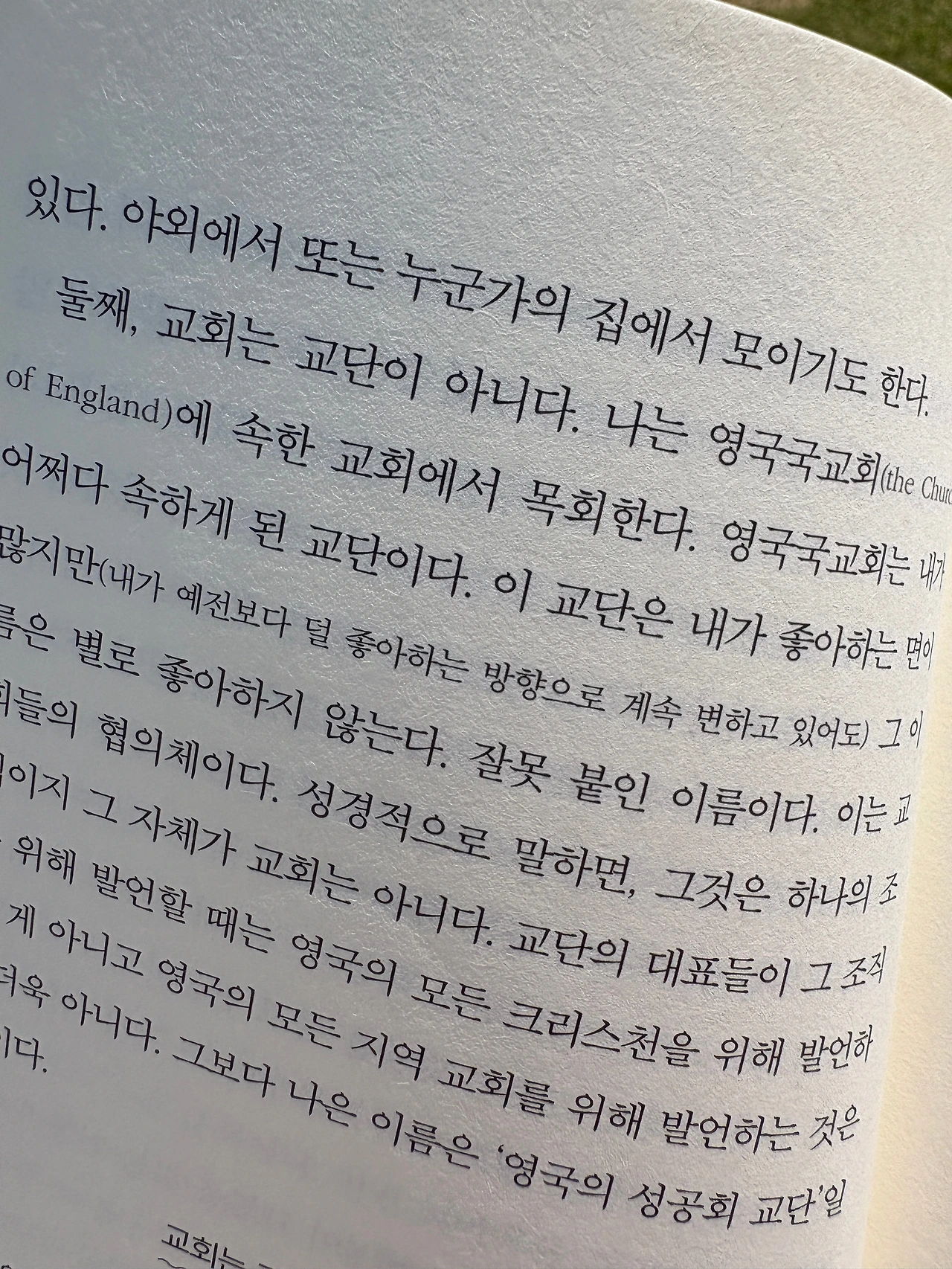 교회는 교단이 아니라는 말에 심쿵했다. 기독교에 대해 모르면 교회가 다 똑같은 거 아닌가 생각할 수 있지만 아니다. 절대 다르고 이게 바람직하지 않다는 걸 알면서도 "나는 쟤랑 달라, 쟤는 우리랑 달라"를 표시해야 하기 때문에 교단은 중요하다. 하지만 부모를 택해서 태어나지 않듯 교단은 어쩌다 속하게 되는 게 맞다. 샘 올베리 목사님도 그런 의미로 적으셨는지는 모르겠지만, 그리고 이 교단은 내가 좋아하는 면이 많지만(내가 예전보다 덜 좋아하는 방향으로 계속 변하고 있어도) 부분은 책을 꼬옥 끌어안고 싶은 기분이 들게 했다. 어디나 다들 비슷하구나 싶었기 때문이다.