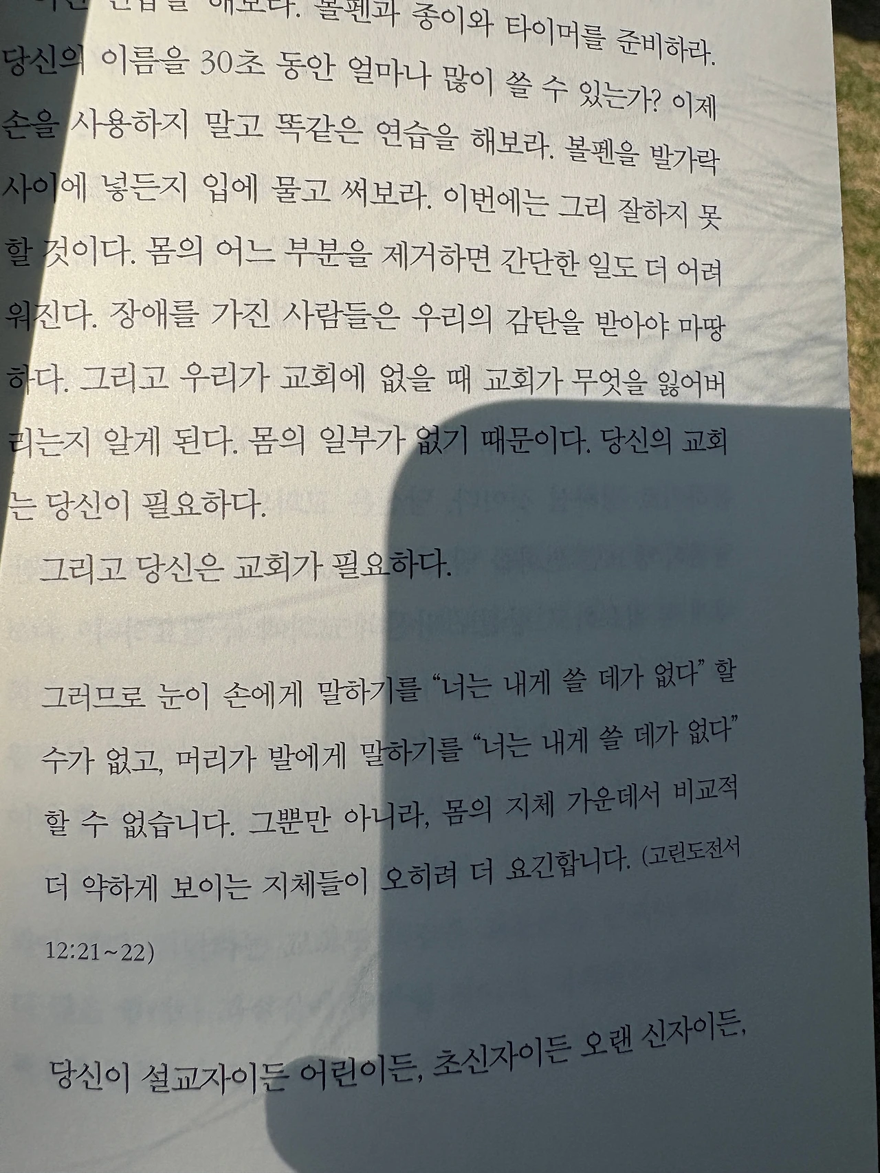 이 말씀을 읽는데 너무 마음에 와닿았다. 나 역시 약하고 때론 나보다 더 약한 지체들을 본다. 우리는 강해 보이고 싶어 하지만 실상은 모두 약하고 나보다 더 약한 자들을 보아야 한다. 강한 자도 있겠지만 강한 자는 잘할 테니까. 약해지기 전까지.