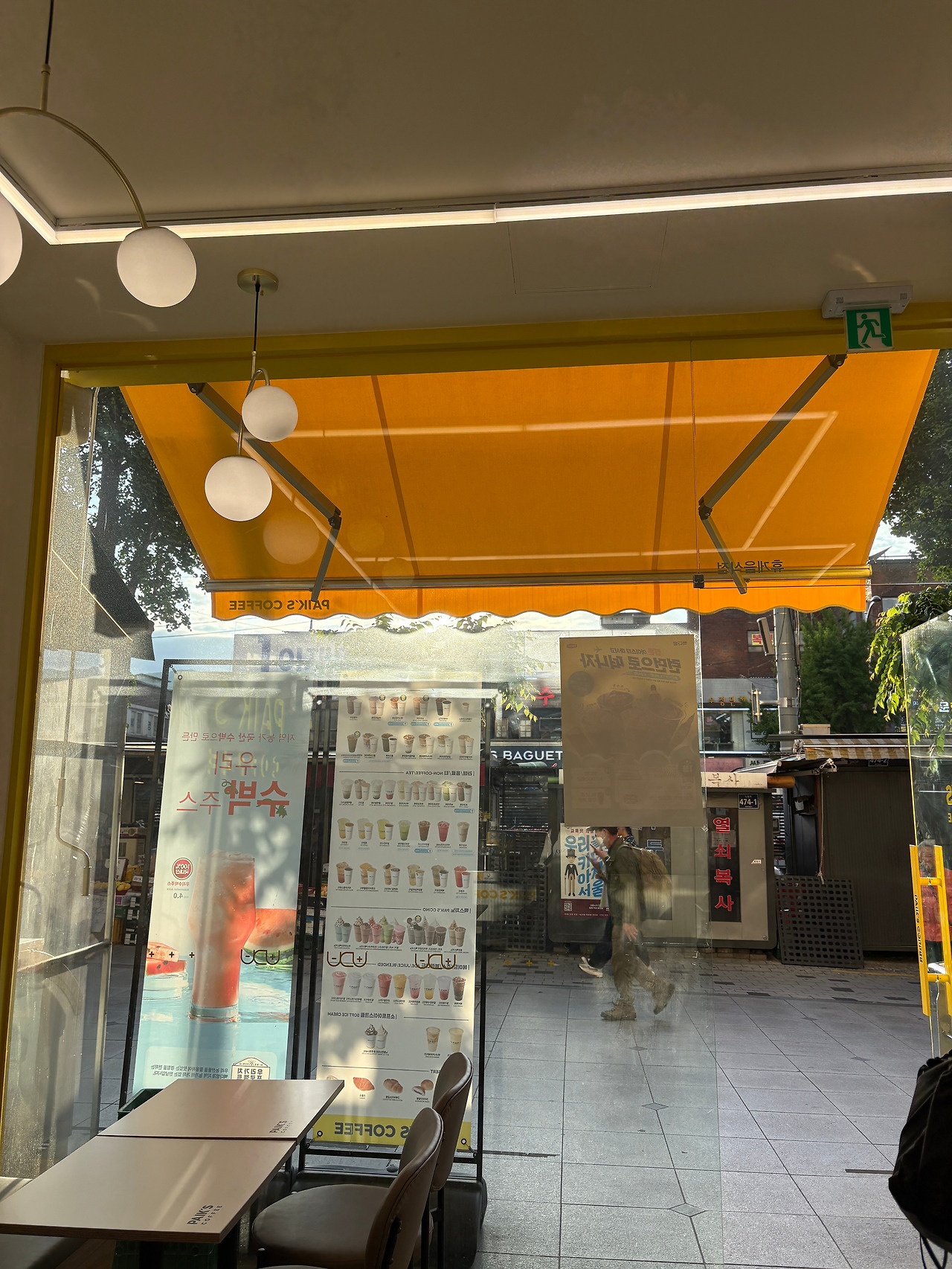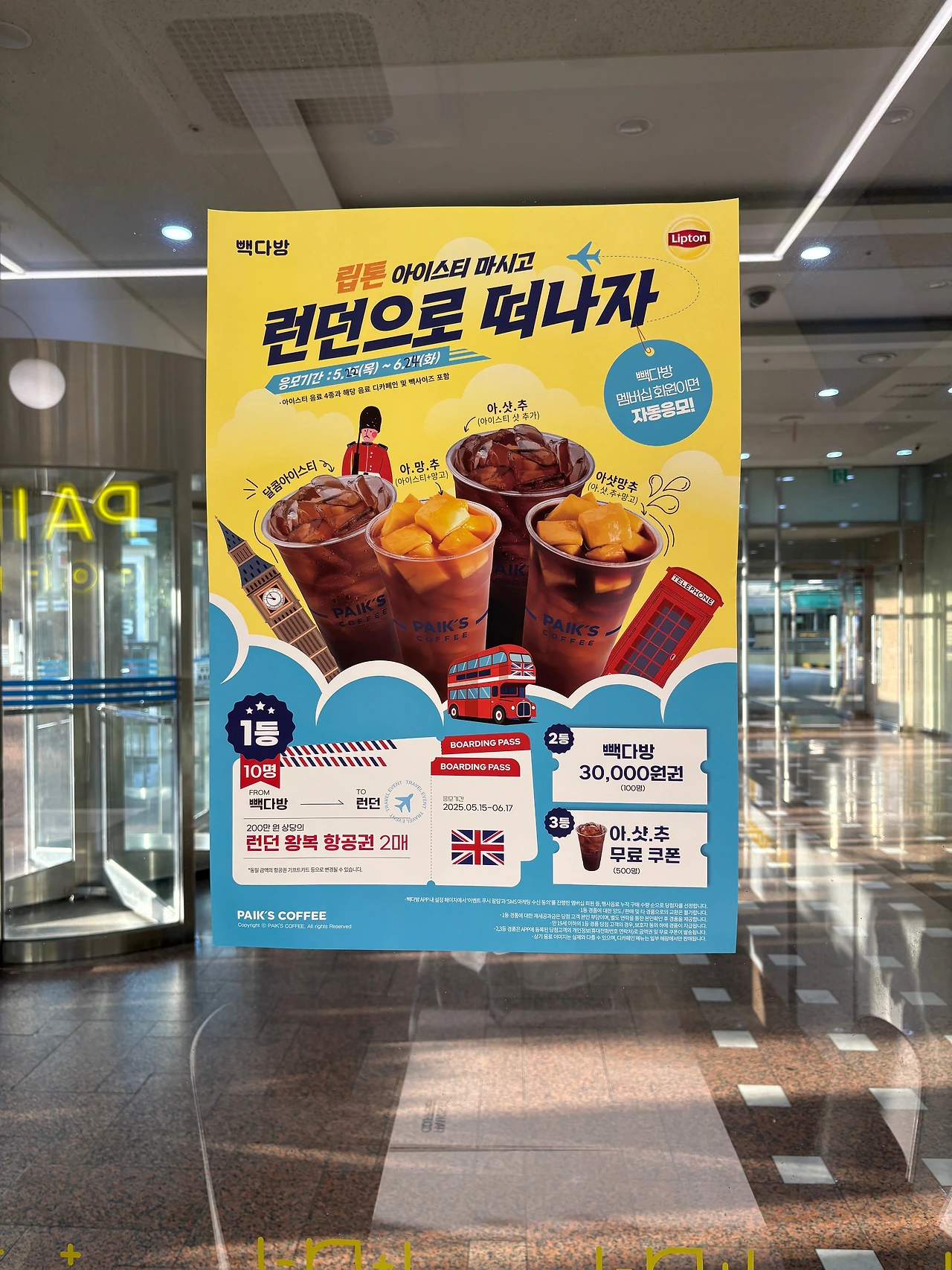 내 사랑 수박주스 사러 빽다방 왔는데 매장 색 너무 예쁜 거 있지. 응모하면 런던 갈 것 같잖아~~~^0^