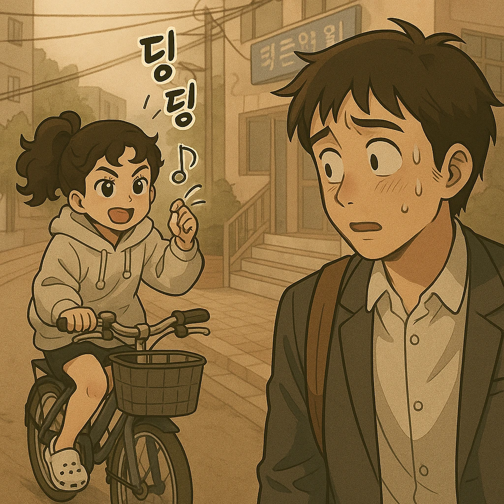 ‘띠로롱’ 학원 도어록 잠기는 소리가 경쾌하게 울려 퍼진다. 주춤대는 인석이를 데리고 계단 아래로 향하는데 자전거 종소리가 요란하게 들려온다. 여지없이 인영이다. 커다란 자전거에 앉아 깨금발로 서서는 바로 앞에서 종을 울려댄다.
