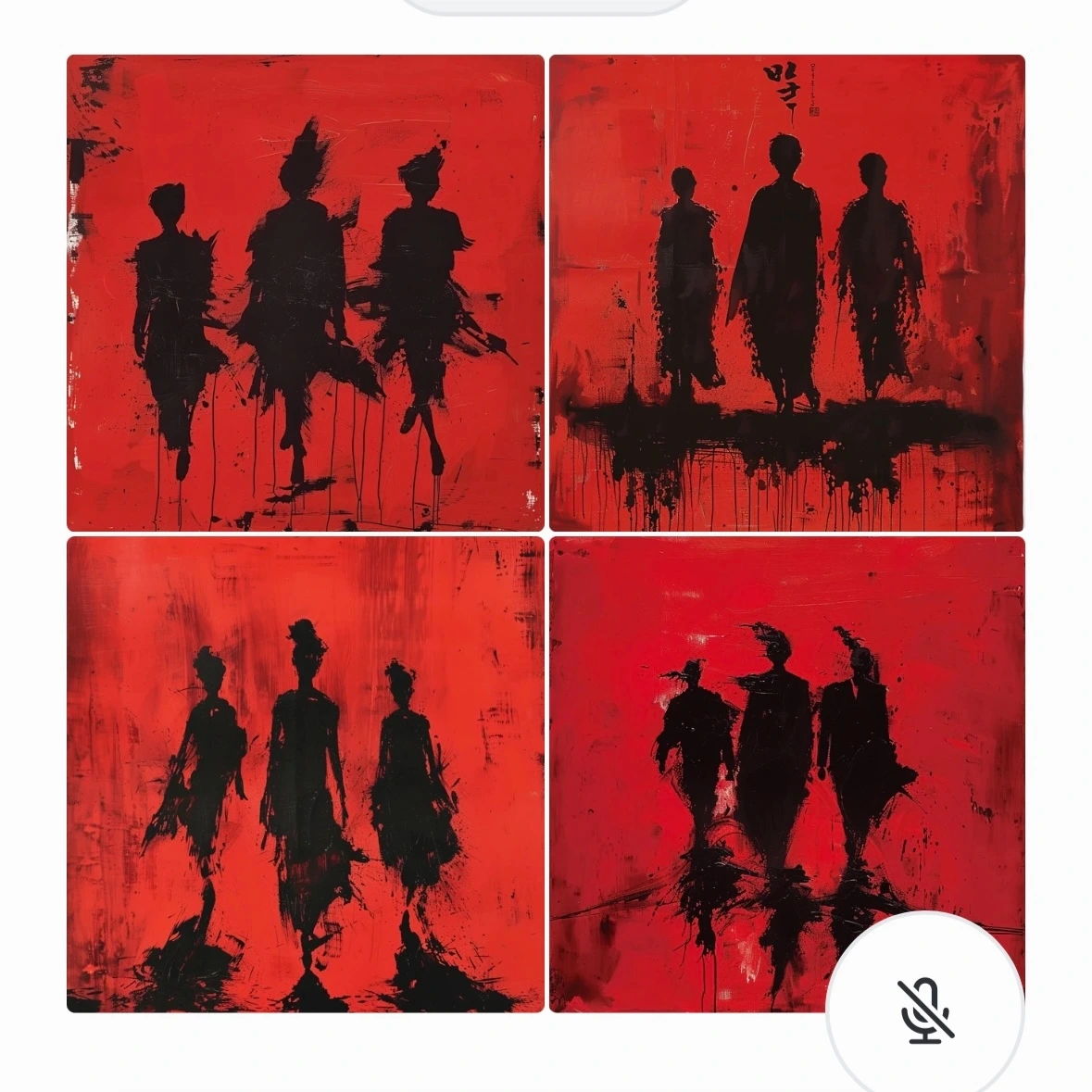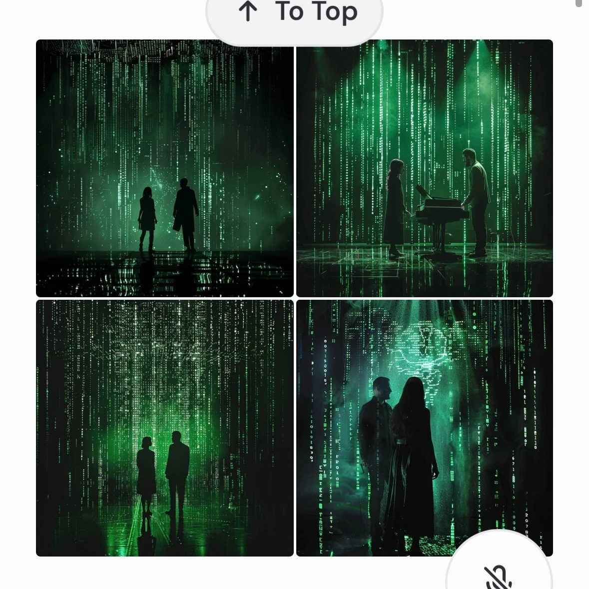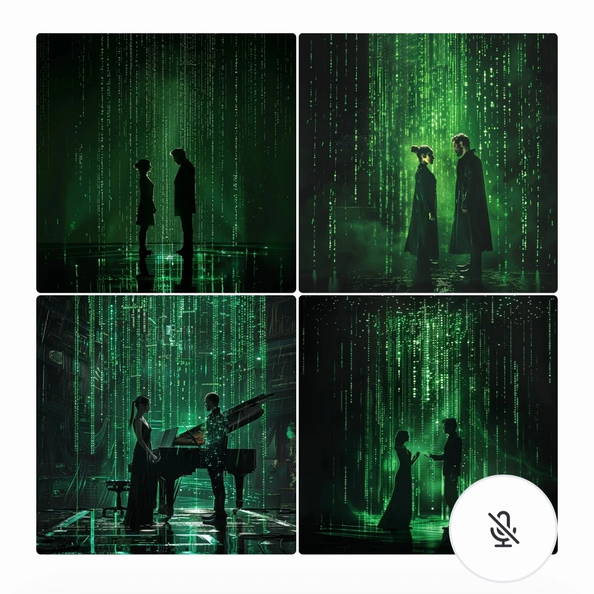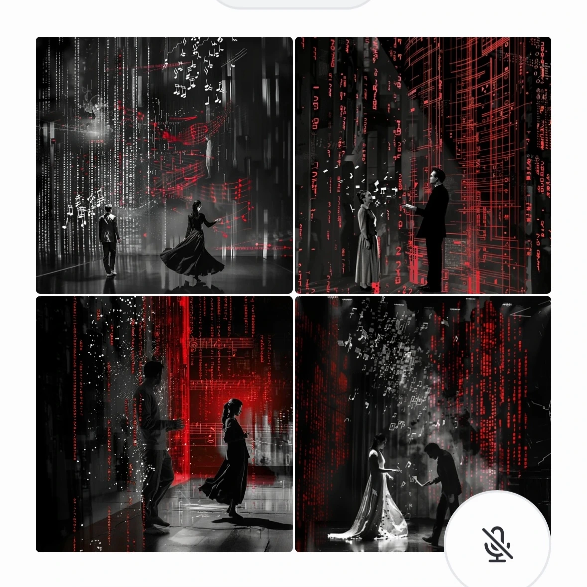 내용은 AI와 인간의 탐구, 협업, 생각하고 있는 이미지는 매트릭스 같은 언어코드 화면, 물랑루즈가 주는 느낌. 모두 한 번에 담을 건 아니고 버전을 세 가지 만들 거야