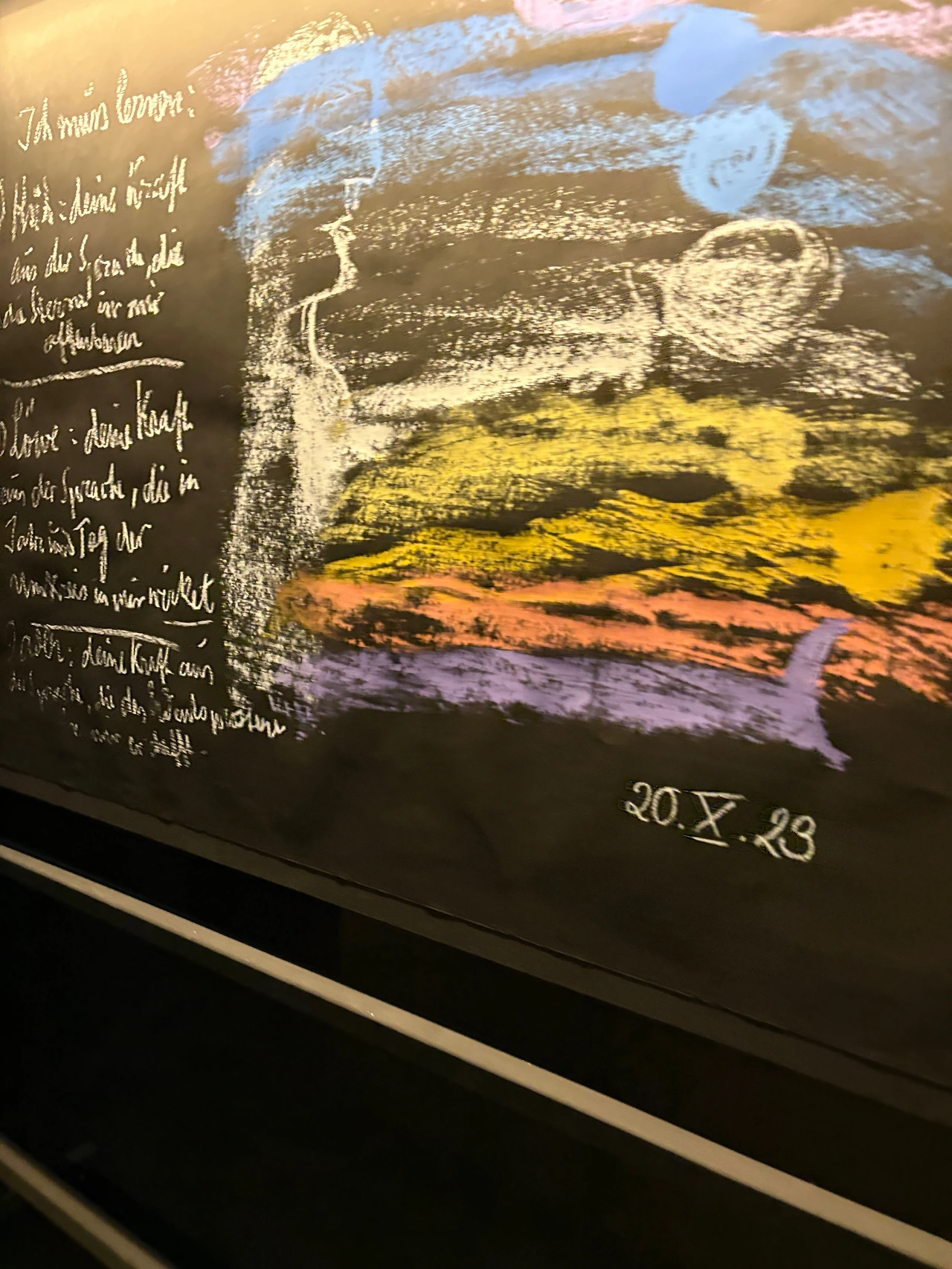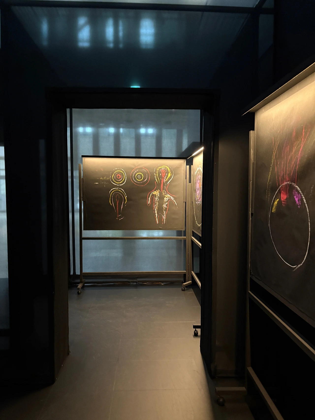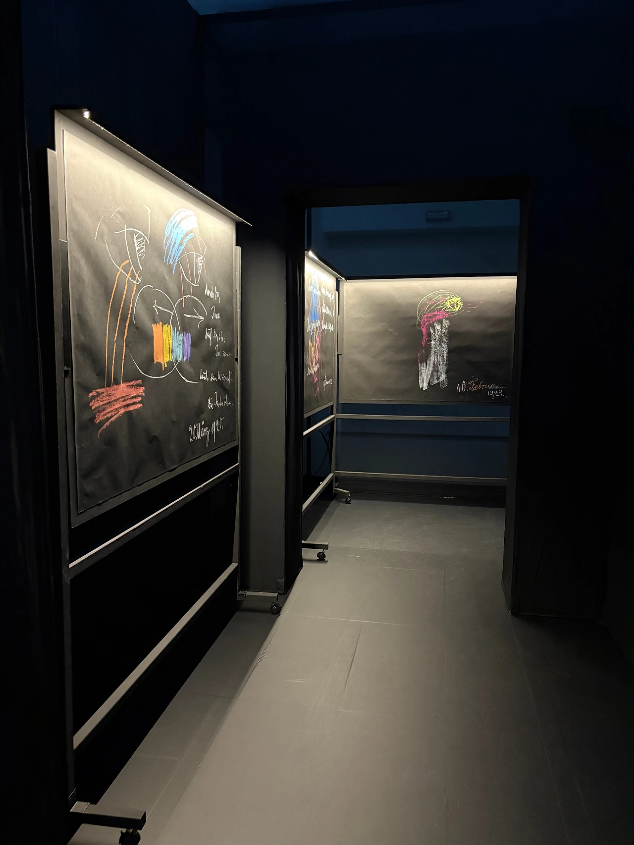 강령술의 기초가 적힌 칠판을 지나간다. 튜토리얼.