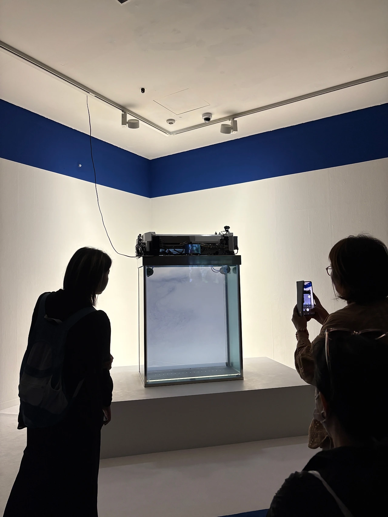 〈유령〉은 고인의 이미지를 물에서 출력하는 인쇄 장치입니다. 잉크젯 프린터가 물 표면에 이미지를 새기면 곧이어 아래의 수조로 흘러 들어가고, 인쇄된 망자의 사진은 점차 물에 녹아 사라집니다. 이후 수조 속 물은 여과 및 정화 과정을 거쳐 다음 인쇄를 위한 상태로 되돌아갑니다. 이러한 순환은 일종의 갱신 또는 환생을 상징합니다. 전 세계 누구나 작품의 웹사이트에 이미지를 올려 프로젝트에 참여할 수 있습니다. <서울 미디어시티 비엔날레 웹페이지 발췌>