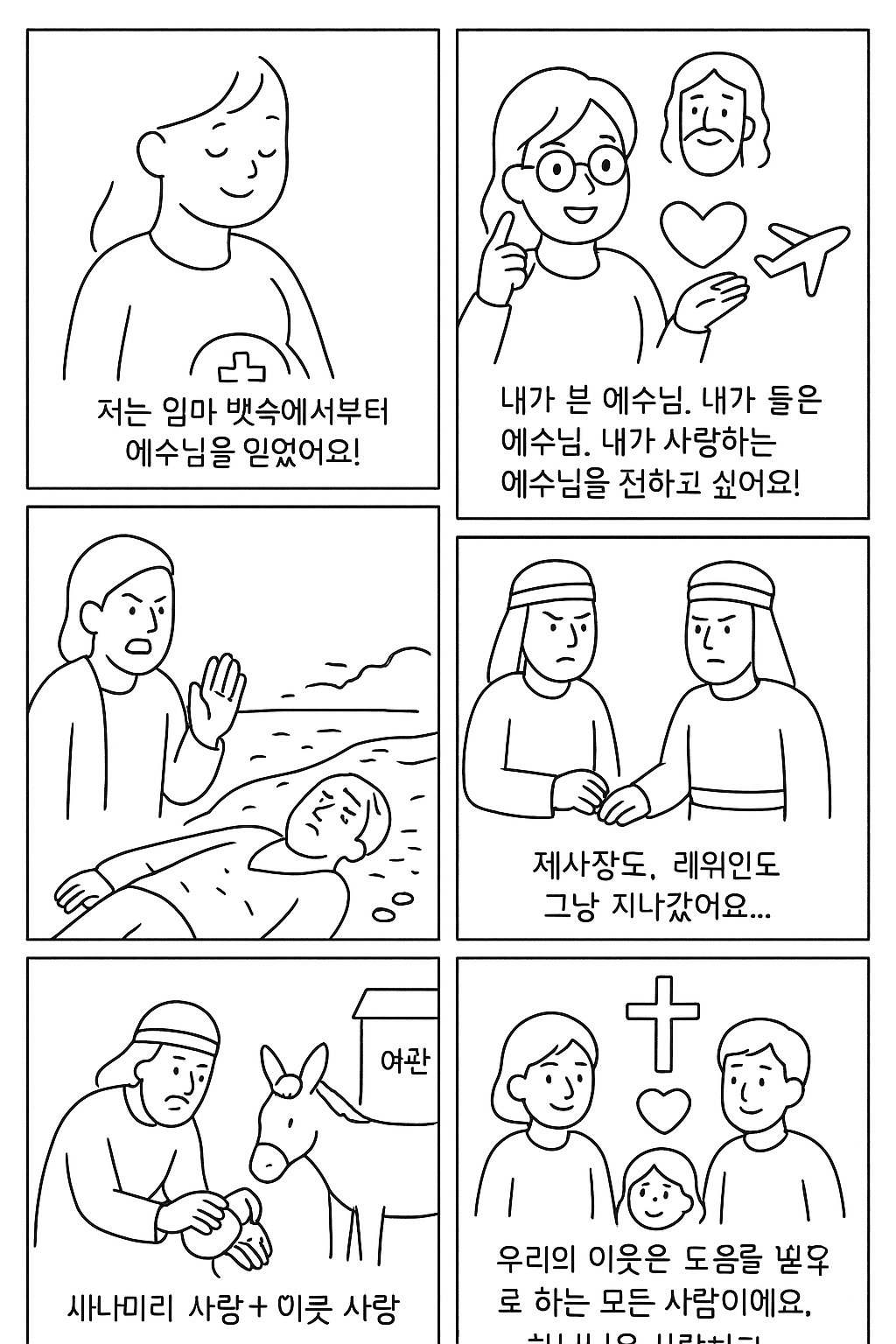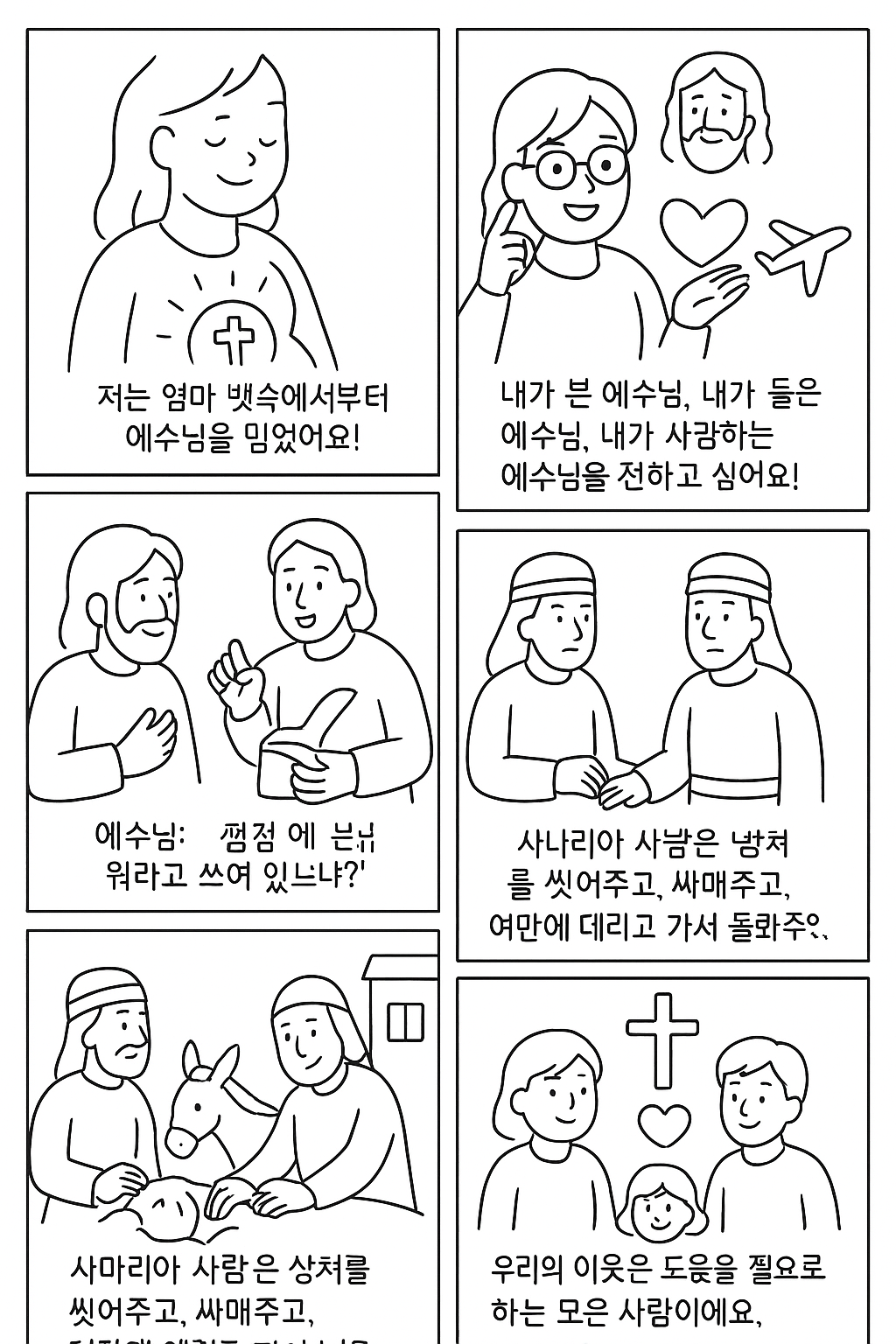 예전에 다녔던 교회의 권사님께서 연락을 주셨다. 네팔 단기 선교에서 어린이들을 위한 설교를 하시는데, 그림 자료가 필요하다고 하셨다. 클로드와 챗GPT의 도움을 받아, 권사님께서 보내주신 설교문에 필요한 그림 콘티를 만들었다.