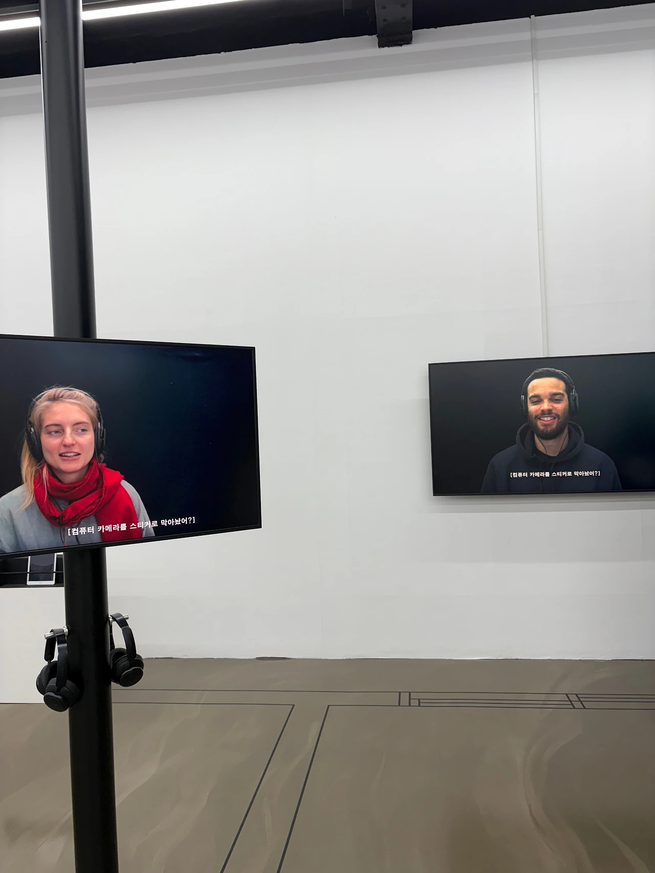 그래서 자리를 바꿔 보았다. 여자의 목소리를 들으며 여자 화면 앞에 서 보기도 하고, 다시 상대의 목소리를 들으며 남자 화면을 바라보기도 했다. 한참을 바꿔보다가 결국 여자의 음성을 들으며 남자를 바라보는 위치에 섰다. 애초에 헤드셋도 그렇게 놓여 있었다.