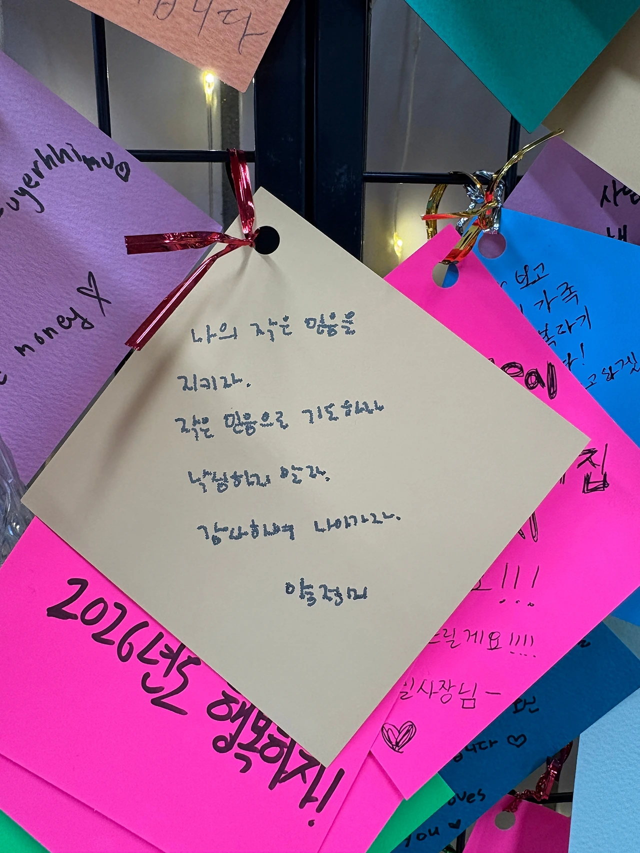월요일. 약속 시간에 늦을까 봐 빠르게 걷고 있는데 지하철 역사 안에 마련된 연말 메모 보드판을 발견하고 걸음을 멈췄다. 가방에서 펜을 꺼내 뭘 쓸까 망설이다가 지금 나에게 꼭 필요한 걸 적어 보았다. 잘하진 못하지만 하자고 적어 놓고 나니 할 수 있을 것처럼 느껴졌다. 여전히 나는 나일 뿐이지만 작은 희망을 가져 본다.