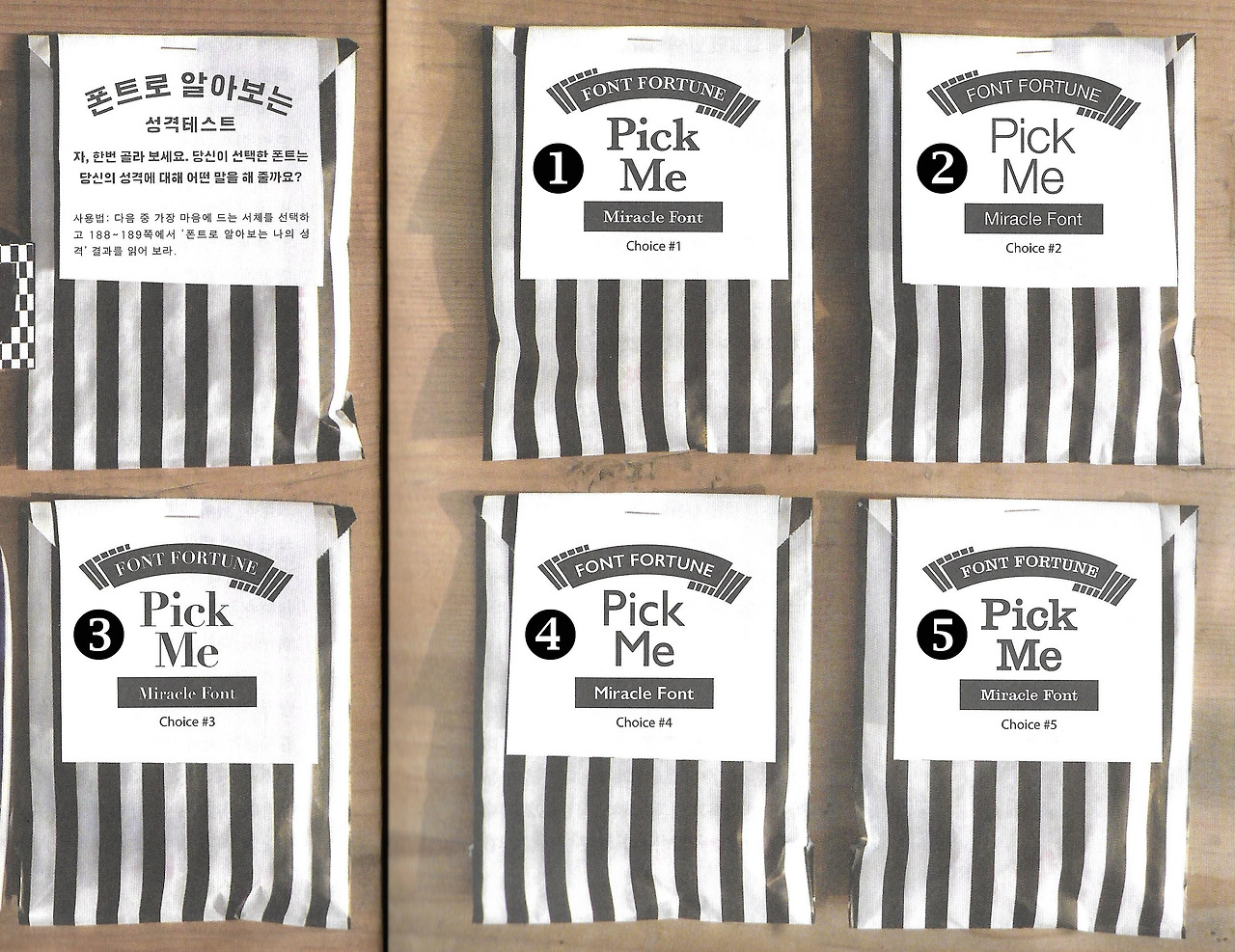 다음 중에서 당신이 물건을 산다고 가정을 했을 때, 어떤 것을 살 것인가? 5가지 중에서 다른 점은 서체, 단 한가지 뿐이다. 가장 마음에 드는 서체를 선택해보자, 선택 후 당신이 성격과 얼마나 일치하는지 아래에서 알아볼 수 있다. (물론 짐짓 심각해지기 말 것!)