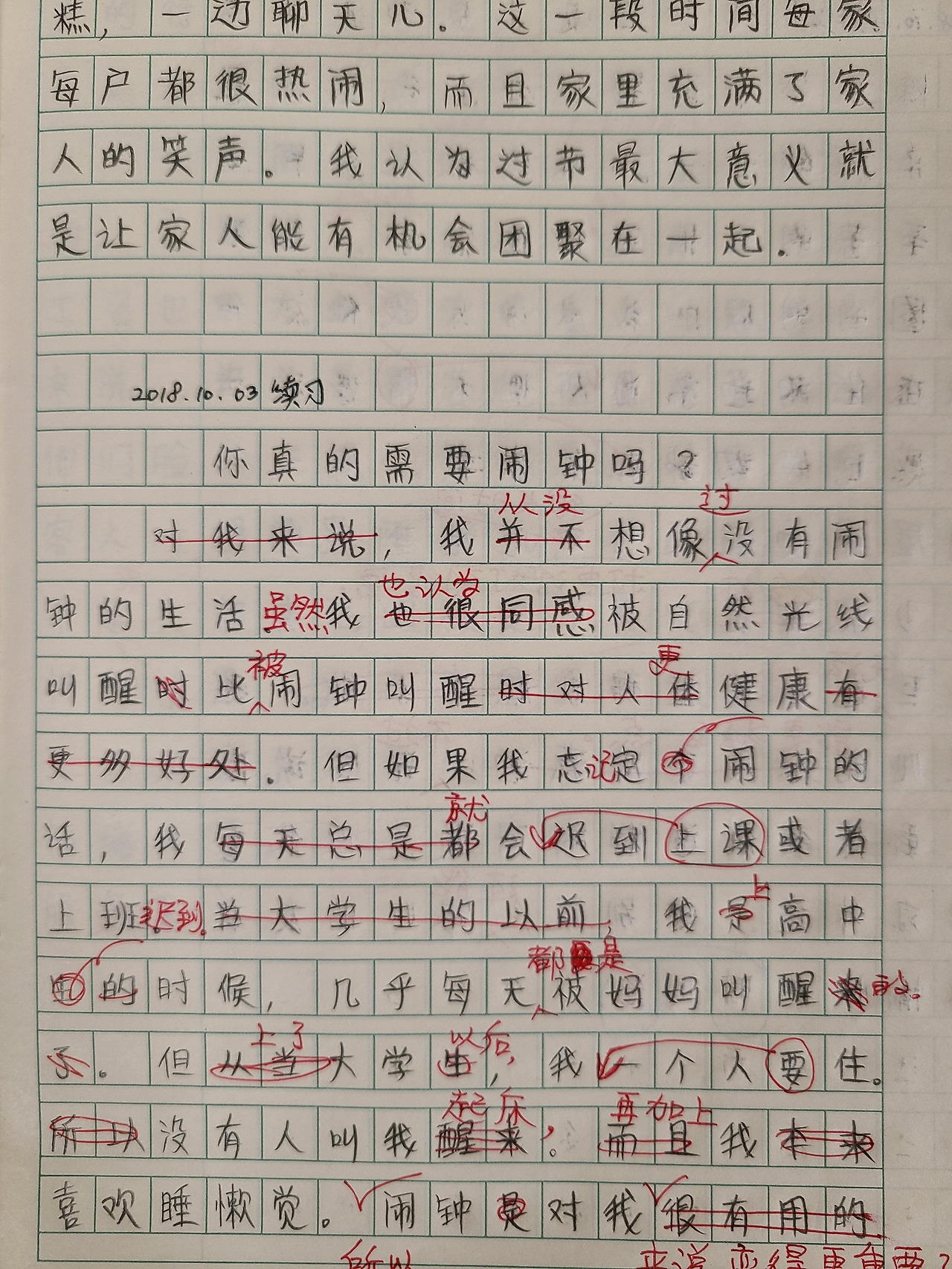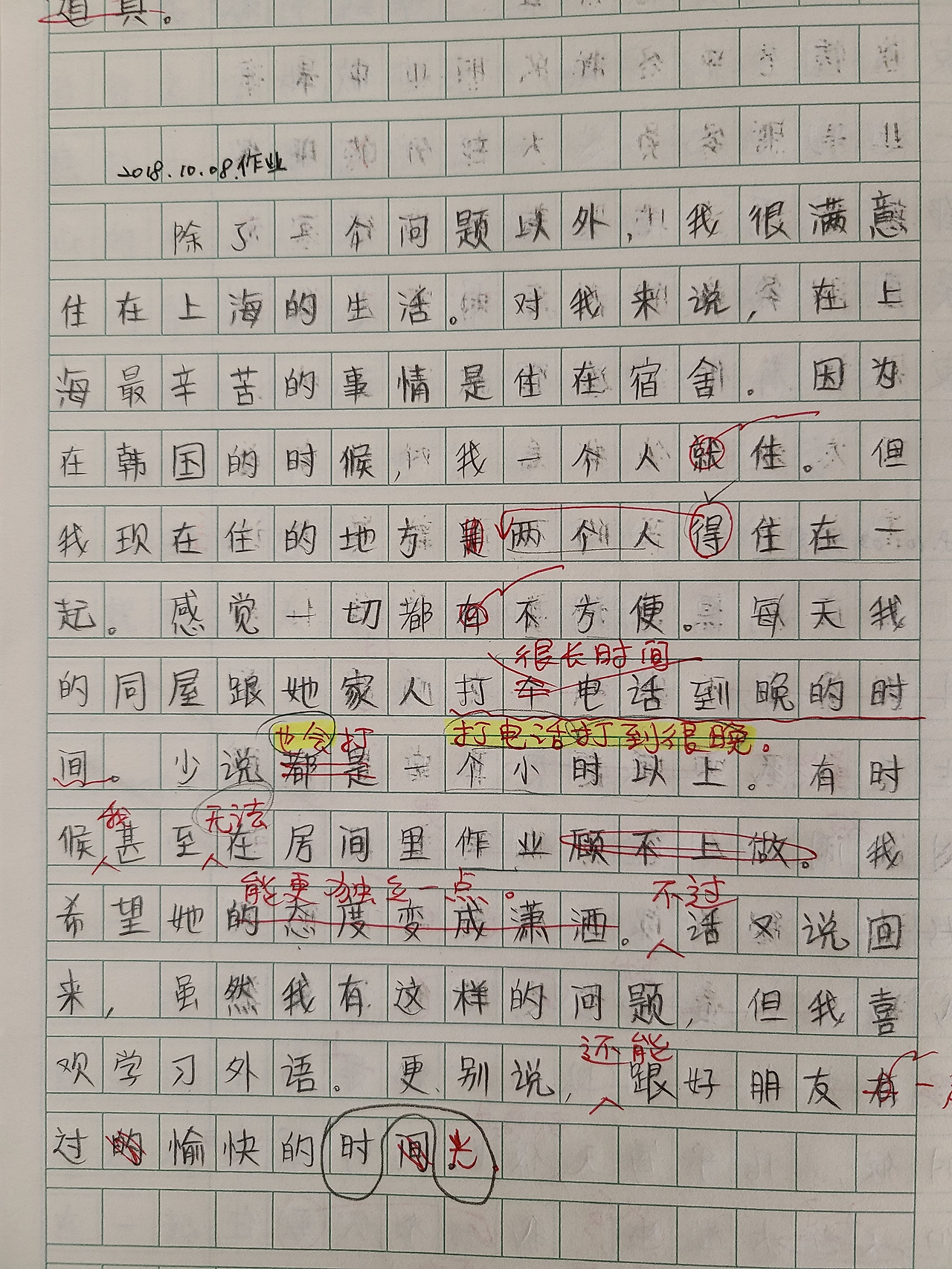 틀린 부분을 선생님께 빨강색으로 수정을 받은 작문숙제