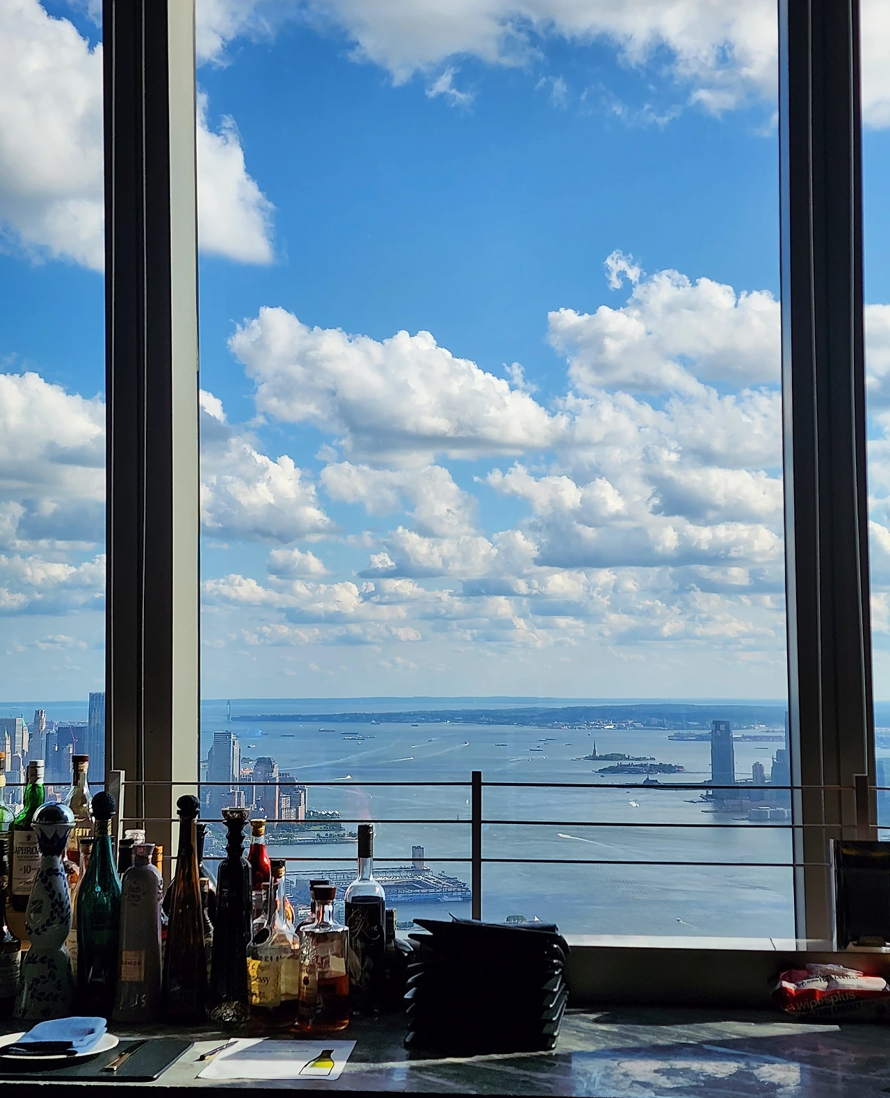 예약을 하고 갔는데 그 전에 일정에 차질이 생겨서 조금 늦었었다. 그래도 맛볼 수 있었다. 바자리에 착석해서 메뉴를 시켰다. 바자리의 여러 가지 술, 리큐르들과 그 뒤 통창으로 보이는 뉴욕 건물의 스카이라인이 예술적으로 배치돼 있다.