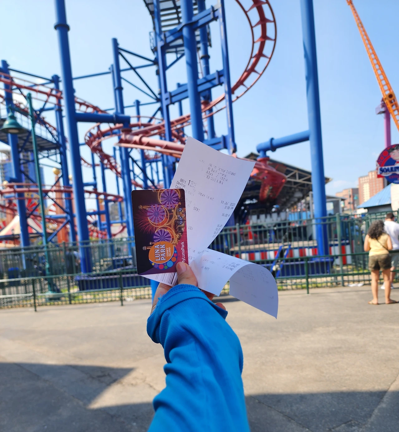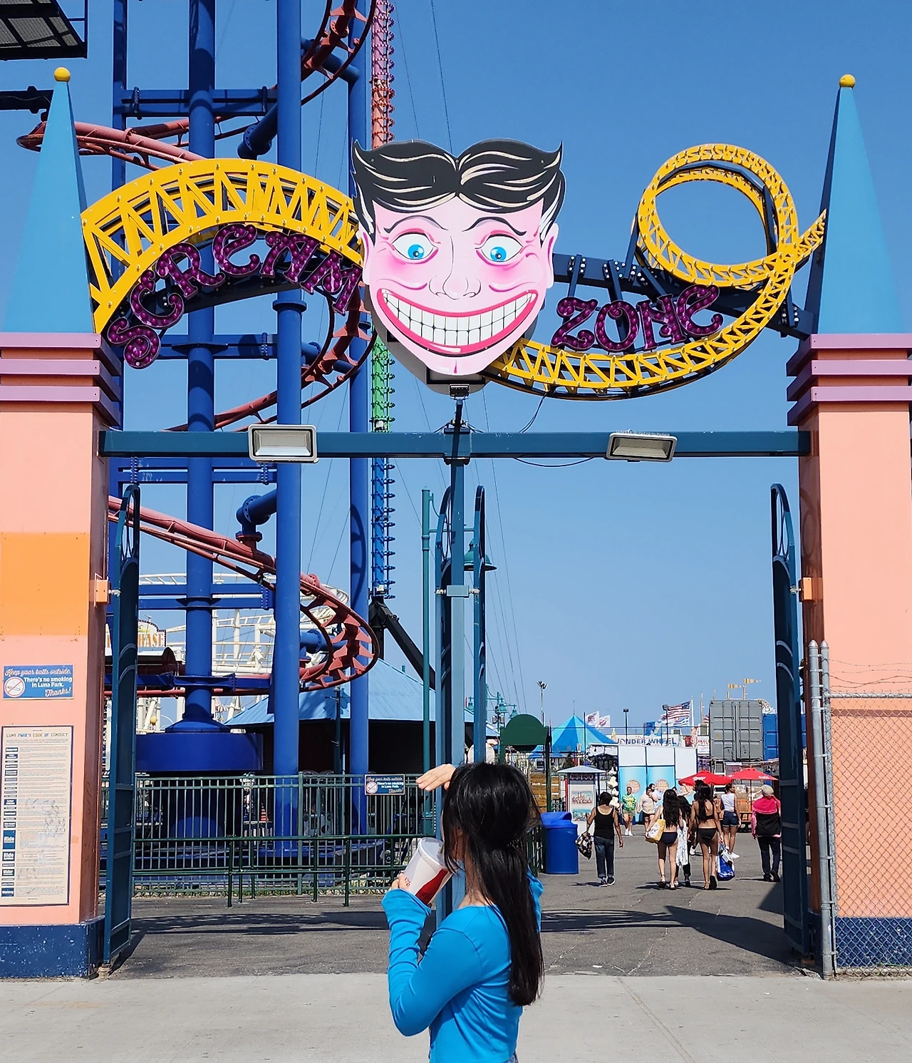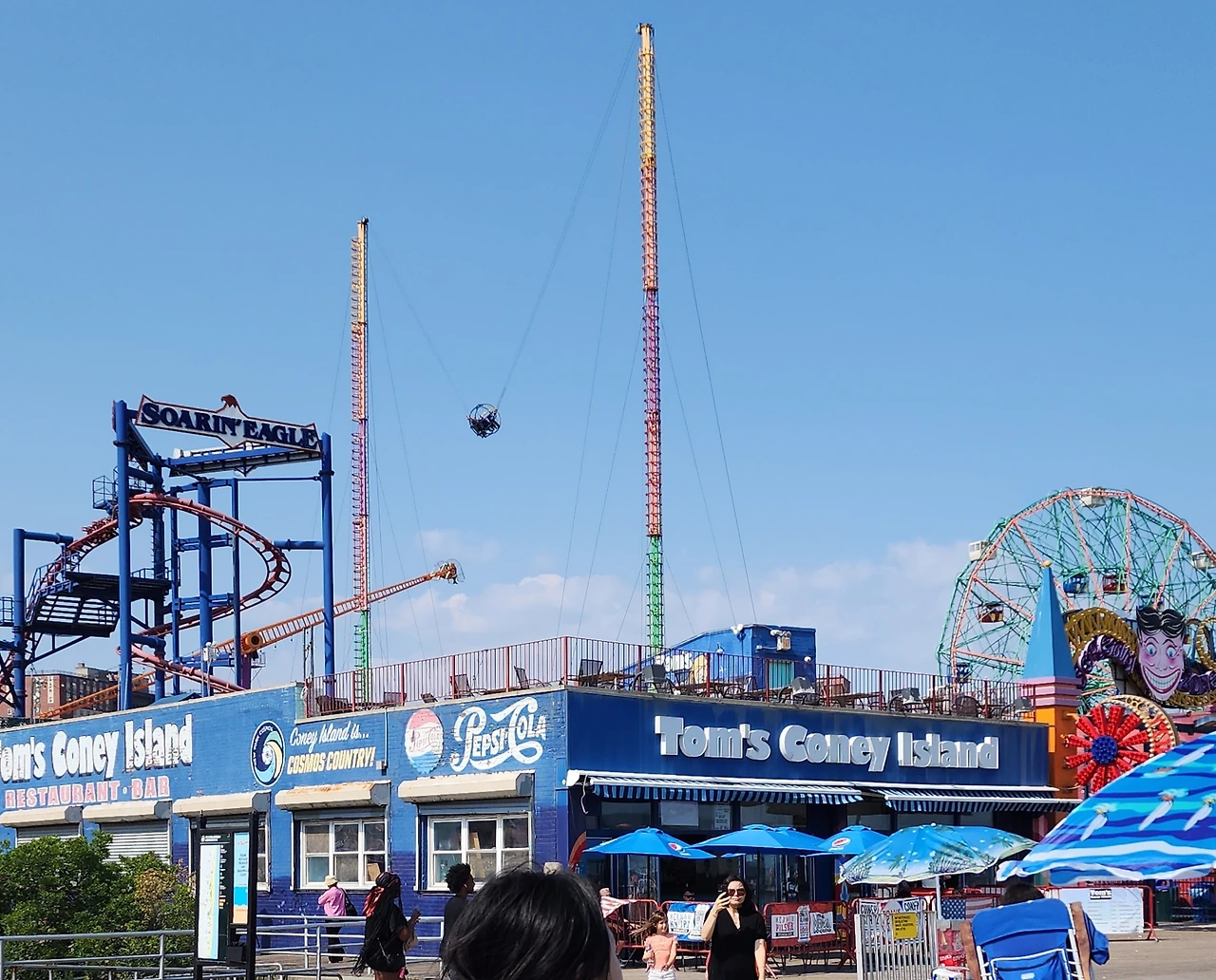 잠이 들어서 2 정거장쯤 더 가는 애교를 한 번 피우고 다시 반대로 가서 다시 한 정거장을 간 다음에 겨우겨우 코니아일랜드에 입성! 루나파크에 들어가는 데는 입장권은 필요 없다. 놀이기구를 타는 탑승권만 필요하다. 갑판처럼 돼 있는데 데크 위로 걸으며 공원을 한 바퀴 돌아봤다. 어떤 놀이기구가 재미있을까 고민하다가 타 본 것이 Soarin’ eagle.
