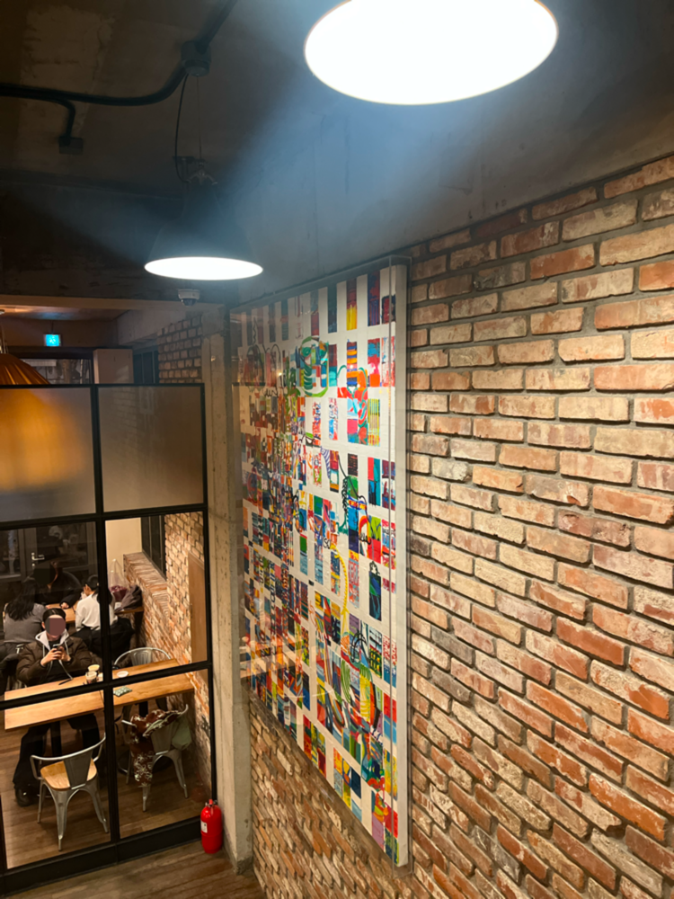 각 층 계단이 시작하는 데, 끝나는 데에 저런 대따 큰 캔버스도 걸려 있었고, 조명이나 인테리어도 전체적으로 따뜻한 분위기를 주는 웜한 톤이라 지금같은 겨울 날씨와 잘 어울린다고 생각했다.