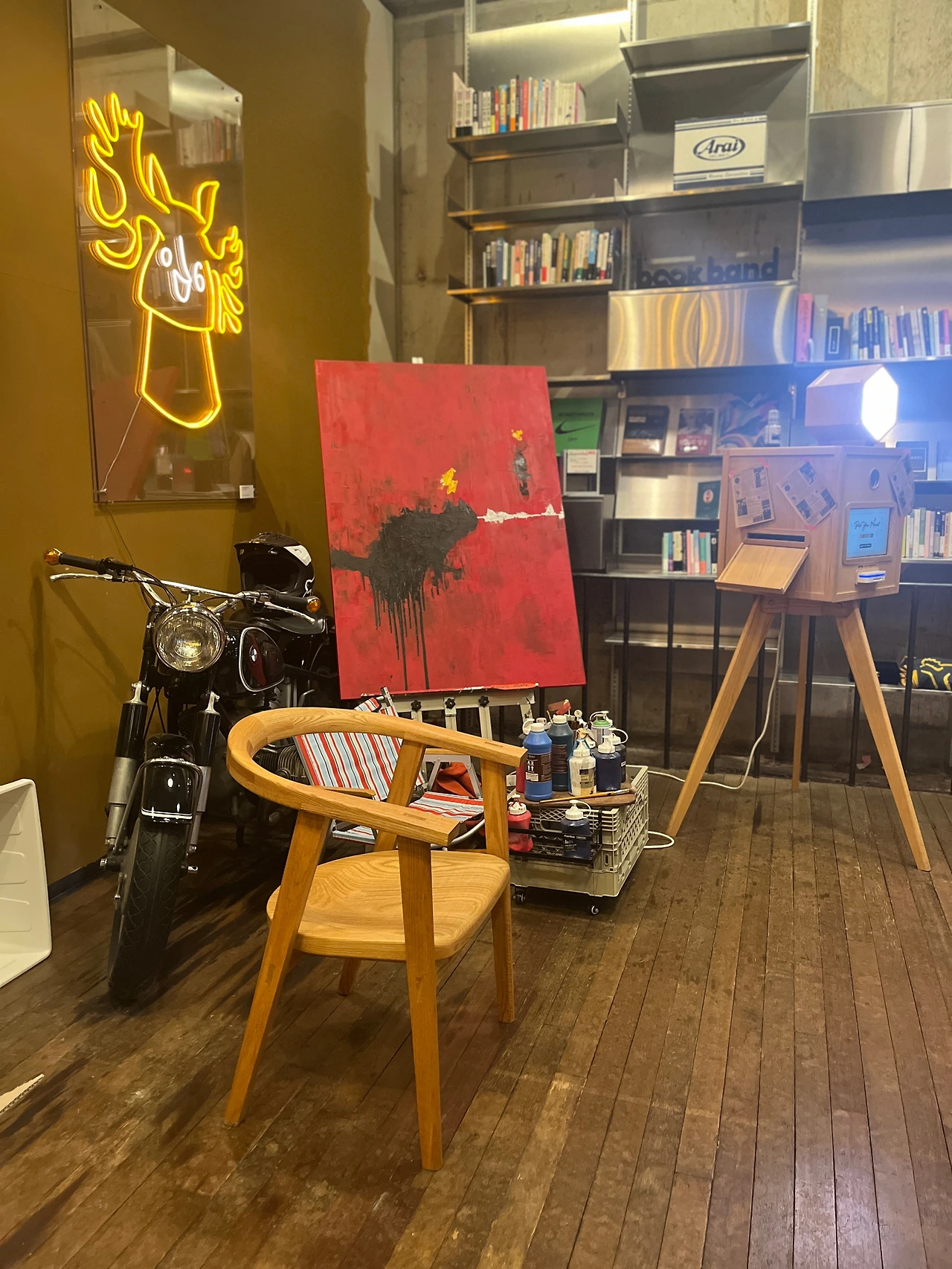 카페 전체가 지하를 포함해서 3층정도였는데, 1층. 입구에 들어가면 입구 우측에 요러한 작업물들이나 오브제들이 마련되어 있고, 수동 사진기 ? (버튼 누르면 종이에 사진이 인쇄돼서 나오는) 그런 게 있어서 돈을 내고 인생네컷 찍듯이 사진도 찍을 수 있었다.