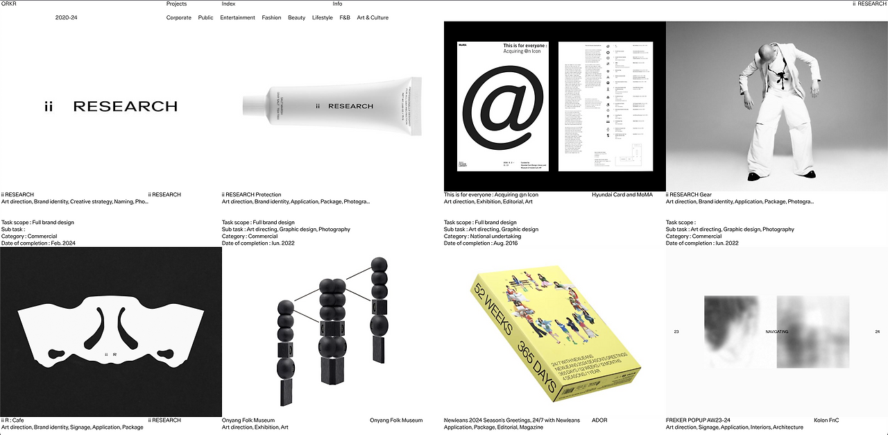 ORKR의 작업물은 한눈에 훑어보면 화려하고 여러 번 감상하면 짜임새가 느껴지는 것이 특징이다. 추상적인 대상에서 출발하여 그들만의 근본으로 브랜드를 다듬어가는 포트폴리오를 살펴보면 확인할 수 있다. 공공기관을 대상으로 한 프로젝트나 아트디렉션, 디자인 시스템 프로젝트를 보아 단순히 '멋있는 것'만을 추구하는 기업은 아닌 것 같다.