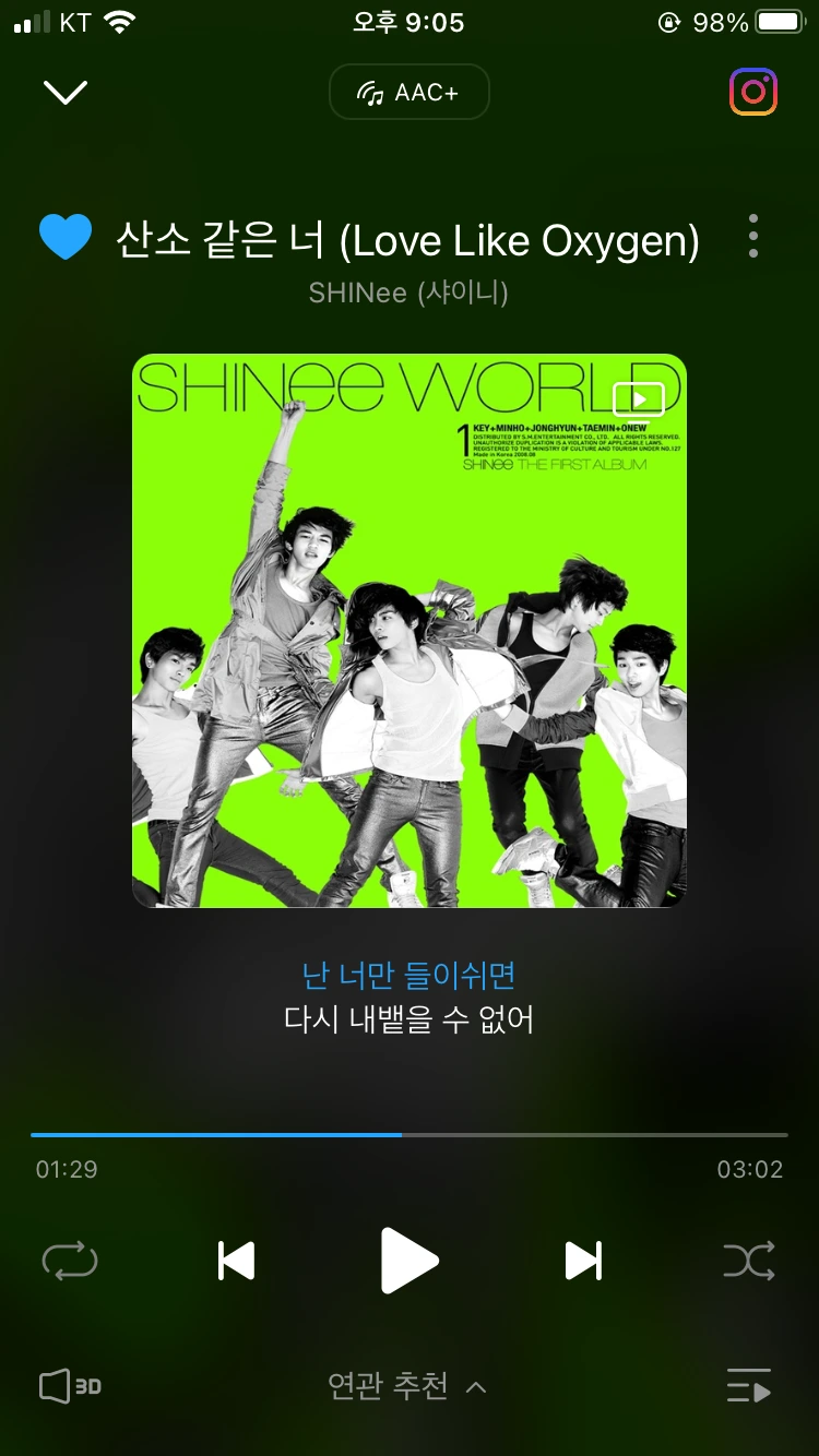 노래란 원래 그런 것이므로. 어떤 시절 속의 자아의 틈을 느슨하게 메꾸고 있는 것이니까. 나에게도 막상 가사나 리듬을 떠올리기는 힘들지만 전주를 잠깐 들으면 삽시간에 그때의 밤공기까지도 리드미컬하게 불러일으키는 노래가 있다. 샤이니의 '산소같은 너'.