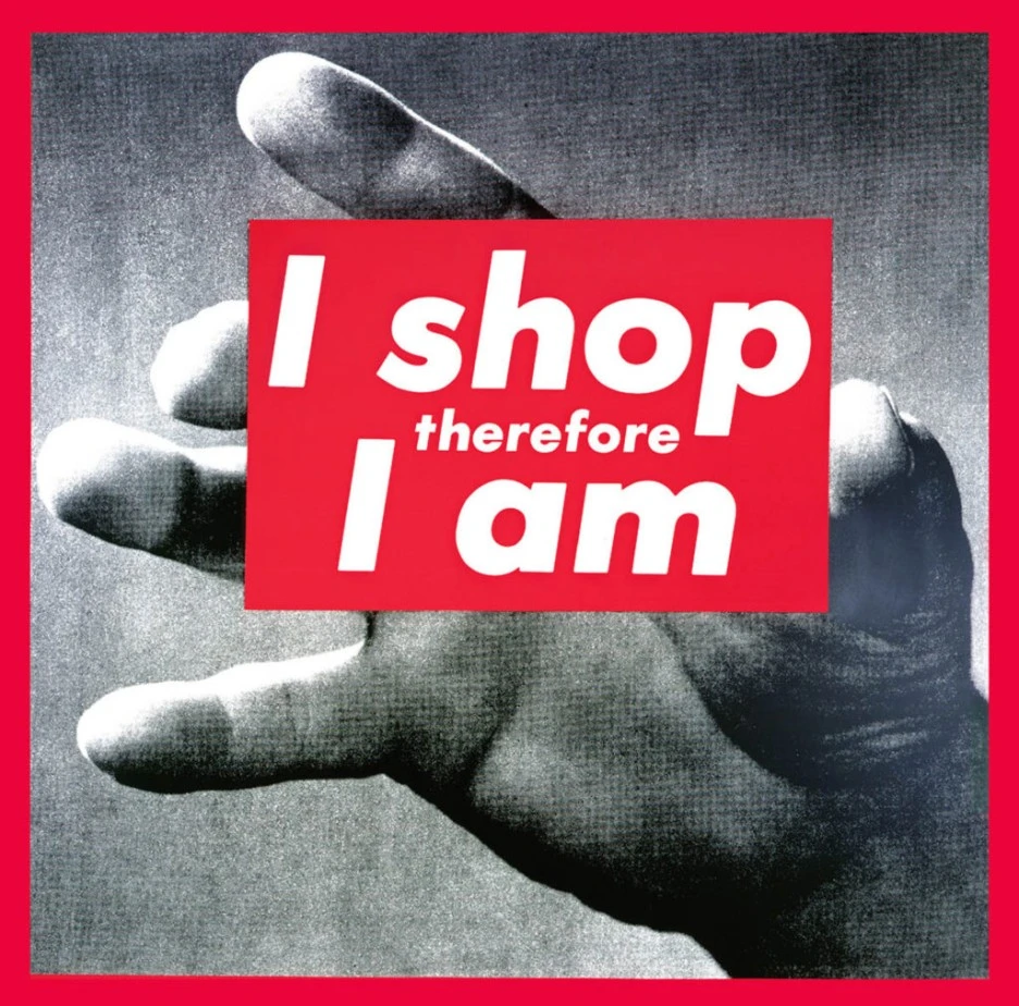 ‘수프림Supreme’ 브랜드는 실제 물건보다 브랜드의 힘이 좌우하는 대표적 사례로서 브랜드가 하나의 비즈니스 모델이 된 경우다. 미국 페미니스트 개념미술가로 유명한 바바라 크루거Barbara Kruger의 대표작은 1987년 《나는 쇼핑한다. 고로 존재한다 I Shop, Therefore I Am》이다. 빨간 바탕에 흰 글씨로 쓰여진 이 문장은 현대인의 소비문화를 비판한 작품이었다.