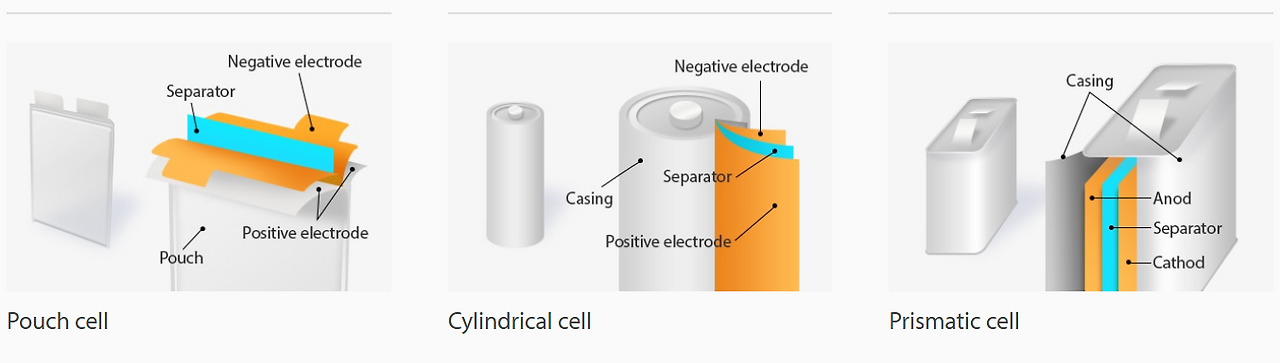 배터리 셀 (Cell)은 Pouch (파우치형), Cylindrical (원통형), 그리고 Prismatic (각형)으로 구분합니다.