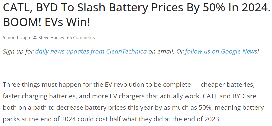 세계 최대 EV 배터리 제조 기업인 CATL과 BYD에서는 2023년 말 대비 2024년 올해에 가격을 50% 인하하겠다고 발표하였습니다. 그러면 전기차의 가격 또한 많은 폭으로 떨어지게 될 것입니다. 내연기관 대비 높은 단가로 인해 형성되었던 진입장벽이 낮아지는 결과를 가져올 것으로 기대합니다.