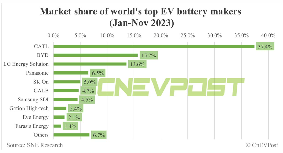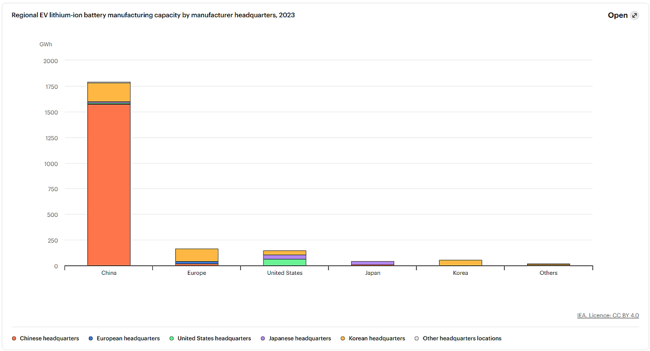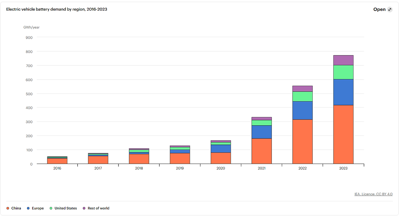 2023년 세계 리튬 이온 배터리 생산 용량은 2,000 GWh을 넘어섰습니다. 그리고 그중 80%가 중국에서 생산되었습니다. 사실상 중국이 배터리 시장을 독차지하고 있다고 해도 과언이 아닐 정도입니다. 이러한 수치는 판매량과 밀접한 연관이 있습니다.