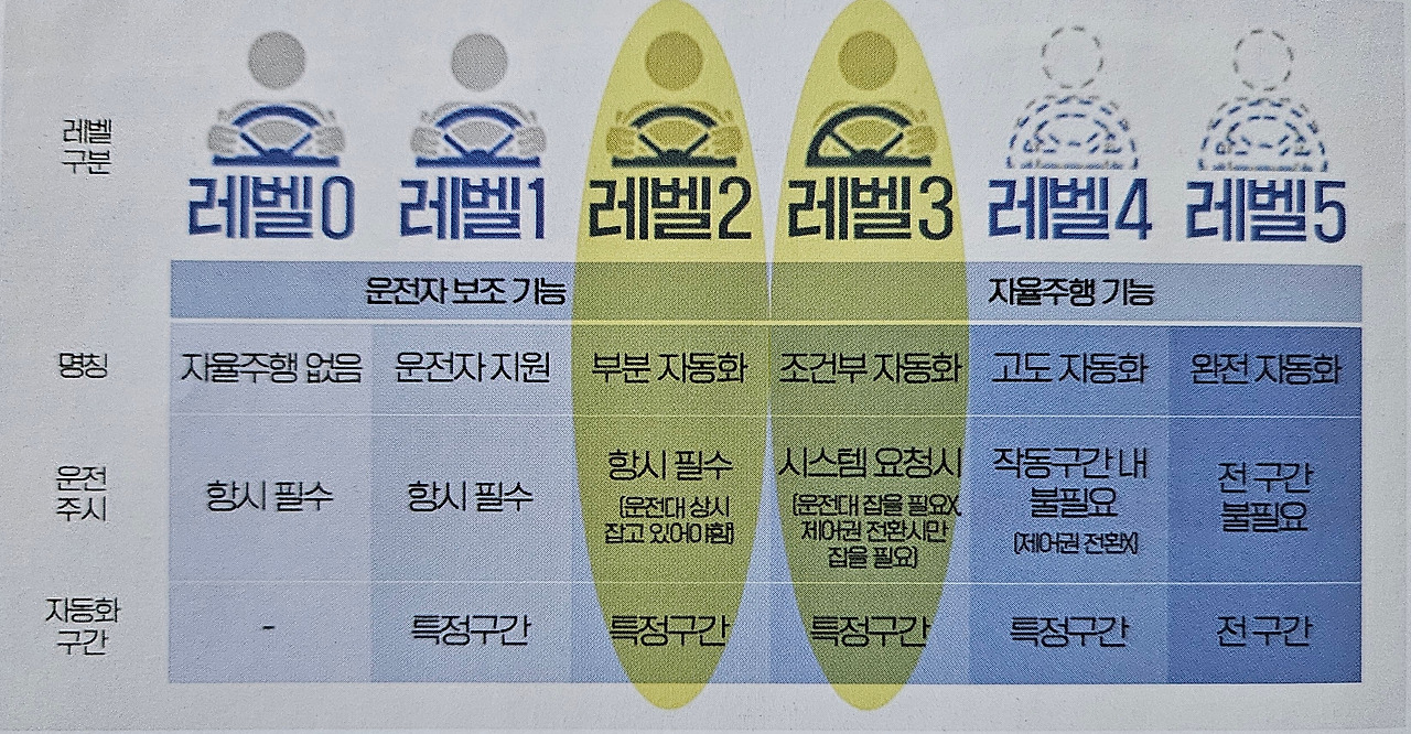 미국 자동차기술학회 SAE는 자율주행 기술을 자동화 수준에 따라 레벨 0에서 레벨 5까지 분류하고 있습니다. 일각에서는 레벨 4까지 와 있다고 말하지만, 아주 제한된 지역이나 특정 조건에서 수행할 때 해당되고 실제 도로상에서는 레벨 2에서 레벨 3으로 가는 과정에 있다고 봅니다.
