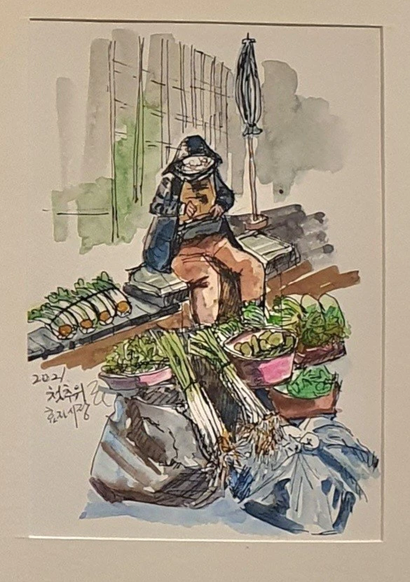 효자시장 노점에서 야채를 파는 할머니가 있다. 늘 보는 모습이지만 첫추위가 온 아침에는 지나갔다가 돌아온다. "할머니, 사진 한 장 찍어도 될까요?" 사진을 보며 그린다. 야채 장수 할머니를 보고 또 보면서 이런저런 생각이 오락가락한다. 어설픈 스케치 시간이 낭만이 된다.