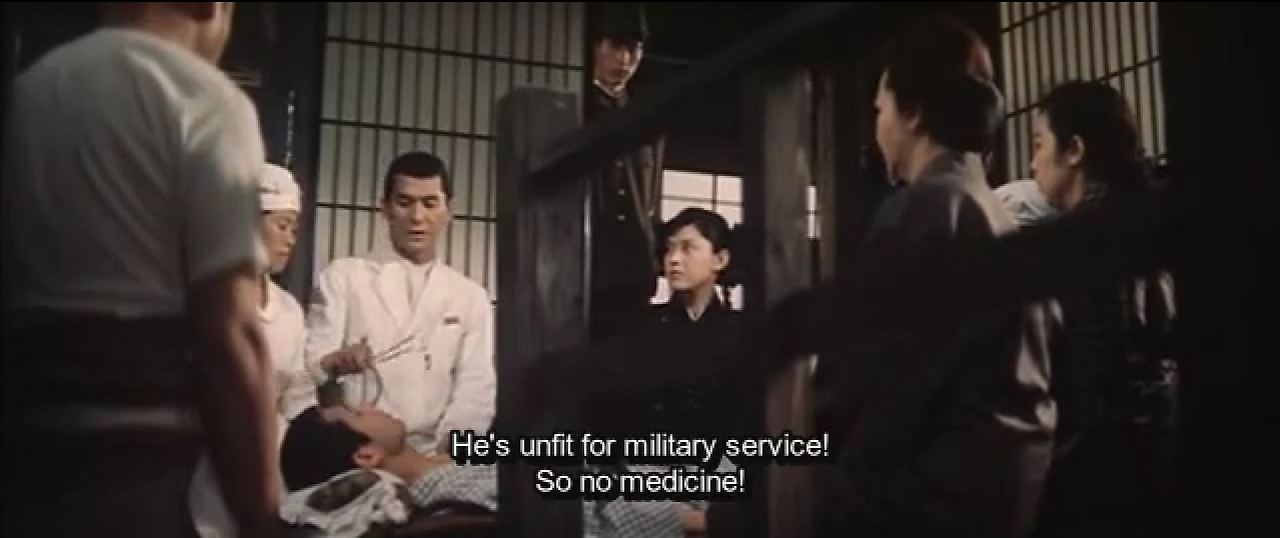 일본이 무조건 항복하기까지, 스크린에 비친 신코와 아키츠 마을사람들은 우리의 조부모가 한반도에서 그랬듯이 모자를 벗고 황궁을 향해 경례하거나 황국신민서사를 외운다. 그리고 '성스러운 전쟁(聖戰)'에 임하는 군인들에게 마지못해 경의를 보이며 그들의 비위를 맞춘다. 그 와중에 여관 구석에서 홀로 결핵을 앓는 슈사쿠는 전시체제에서 군의관의 말대로 '약조차 아까운' 존재이다. 그런 잉여의 존재와, 그를 지극정성으로 보살피는 신코를 카메라는 끈질긴 투샷으로 쫓아가면서, 군국주의에 포섭되기를 거부하는 순수한 휴머니즘을 보여준다. 하지만 이러한 제국주의 비판은 당시 조선인들이 처한 현실과는 다른 차원에 놓여 있다.