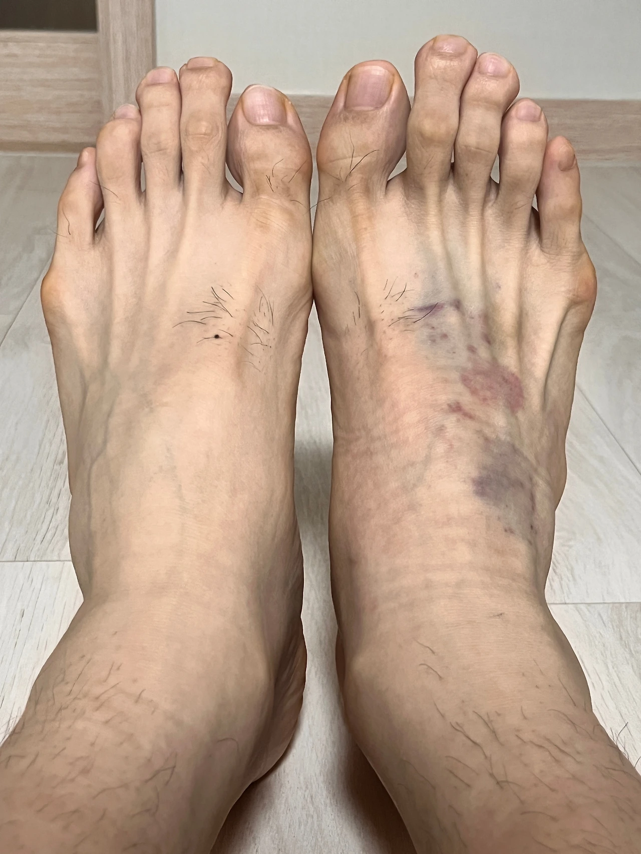 한쪽 발등이 혈관이 하나도 안보일정도로 퉁퉁 붓고 멍이 들었다 치료를 받으면서 사진처럼 되었고 좀 더 치료받고 뛰다가 결국 발등에 실금이 가고 인대 염증이 심해져 뛸 수가 없게 되었다 마라톤 1달을 앞두고 이렇게 돼버렸다