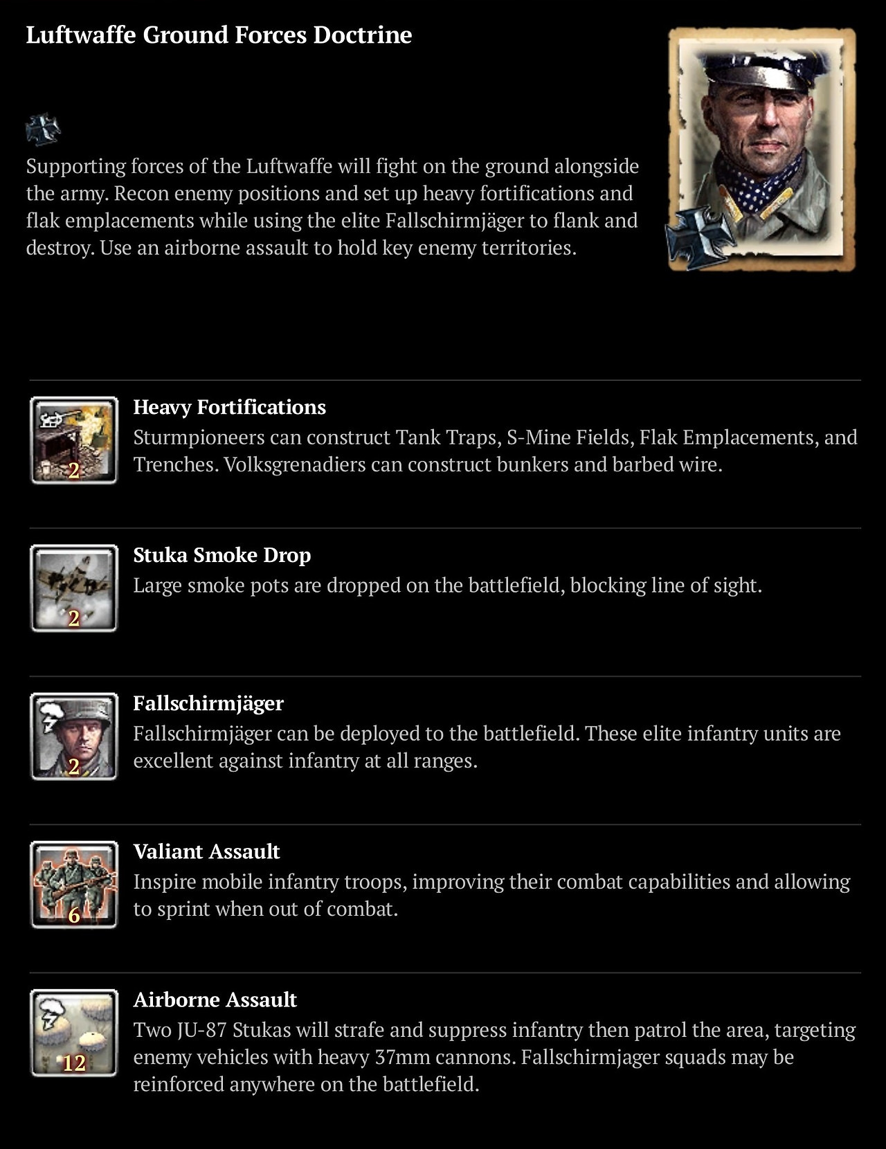 또한, 루프트바페 지휘관은 일정량의 군수품을 사용하여 '용맹한 강습'이라는 버프스킬을 사용한다. 이 버프는 중화기 분대(대전차포 분대, 중기관총 분대, 박격포 분대)를 제외한 모든 보병에게 적용된다. '용맹한 강습'은 이미 강력한 보병 분대의 성능을 강화하기에, 고착된 전선에서 주도권을 되찾거나 강하엽병 분대를 적 후방에서 탈출시키는 데 유용하게 사용될 수 있다.
