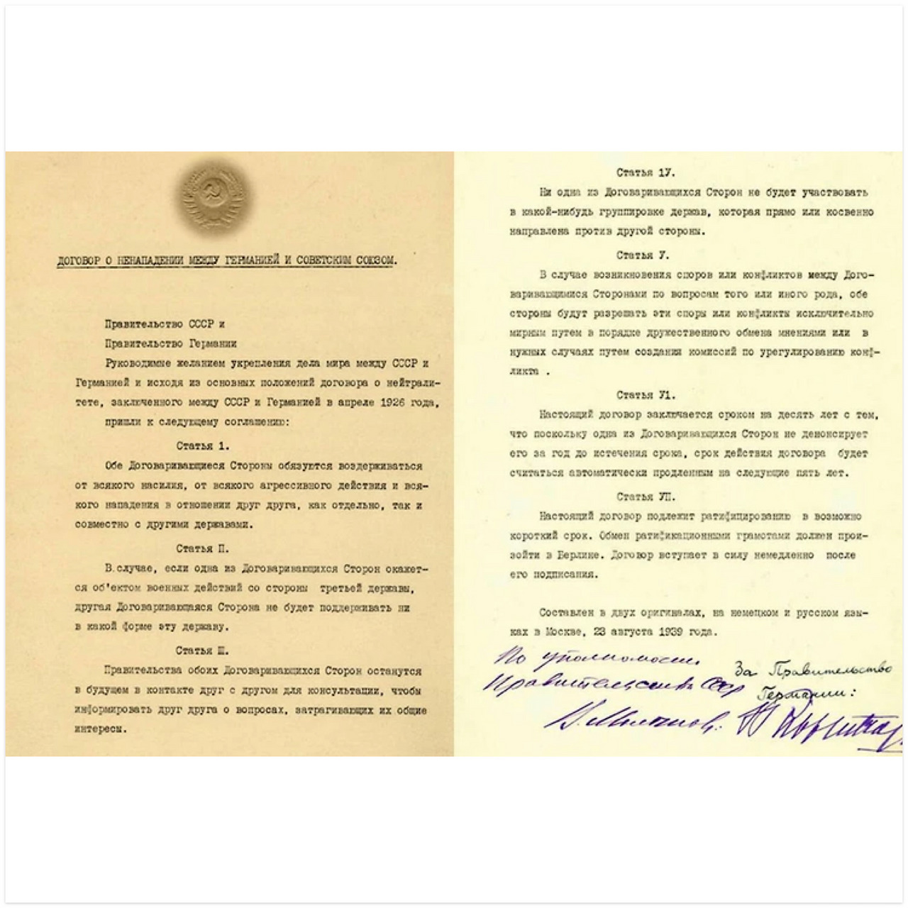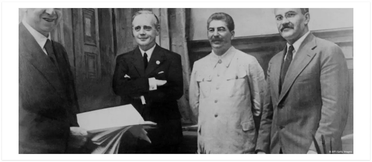 몰로토프-리벤트로프협정 비밀의정서 : 1939년 8월 23일, 나치독일과 소비에트연방이 체결한 독소불가침 조약에 부속된 비밀문서. 공식 조약이 상호 불가침을 약속한 것과 달리, 이 비밀의정서는 폴란드, 리투아니아, 라트비아, 에스토니아, 핀란드, 루마니아 등 동유럽 국가들의 영토를 양국의 세력권으로 분할하는 내용을 명시하였다. 이는 제2차세계대전의 발발과 동유럽의 운명을 멋대로 재단한 중대한 밀약이었다. 놀랍게도 소련은 이 추악한 밀약의 존재를 무려 50년간 부정하다가, 체제가 무너지기 직전인 1989년에야 마지못해 인정했다.