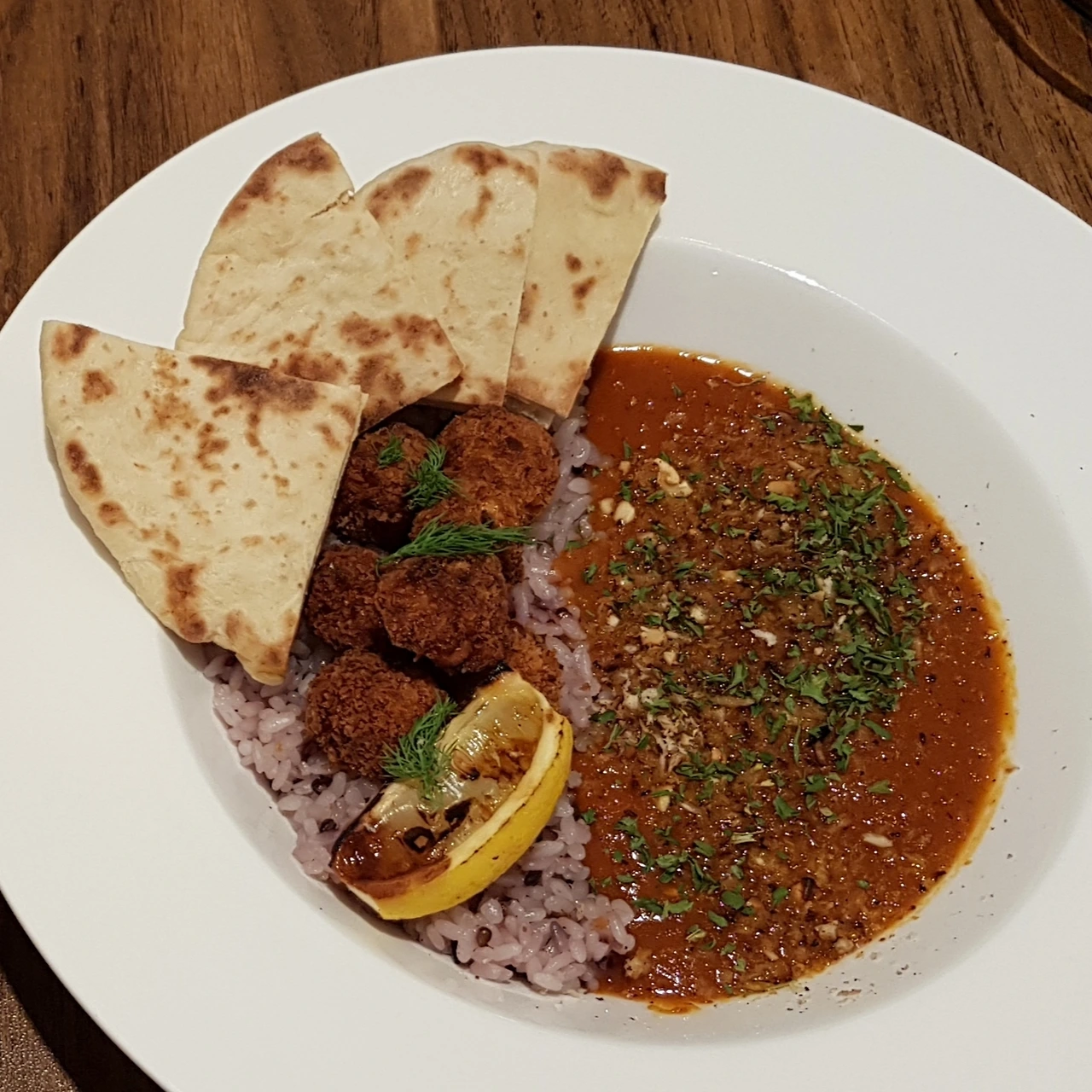 커리는 자극적이지 않고 흑미밥과 잘 어우러졌다. 레몬을 뿌려 먹으니 맛이 깔끔해져서 더 맛있었고 속 편한 한 끼로 아주 좋다는 생각이다. 병아리콩 고로케는 이스라엘과 같은 중동지역에서 많이 먹는 팔라펠 같은데 바삭하고 맛있었다. 난은 부드럽고 살짝 도톰, 담백하니 맛있었다.