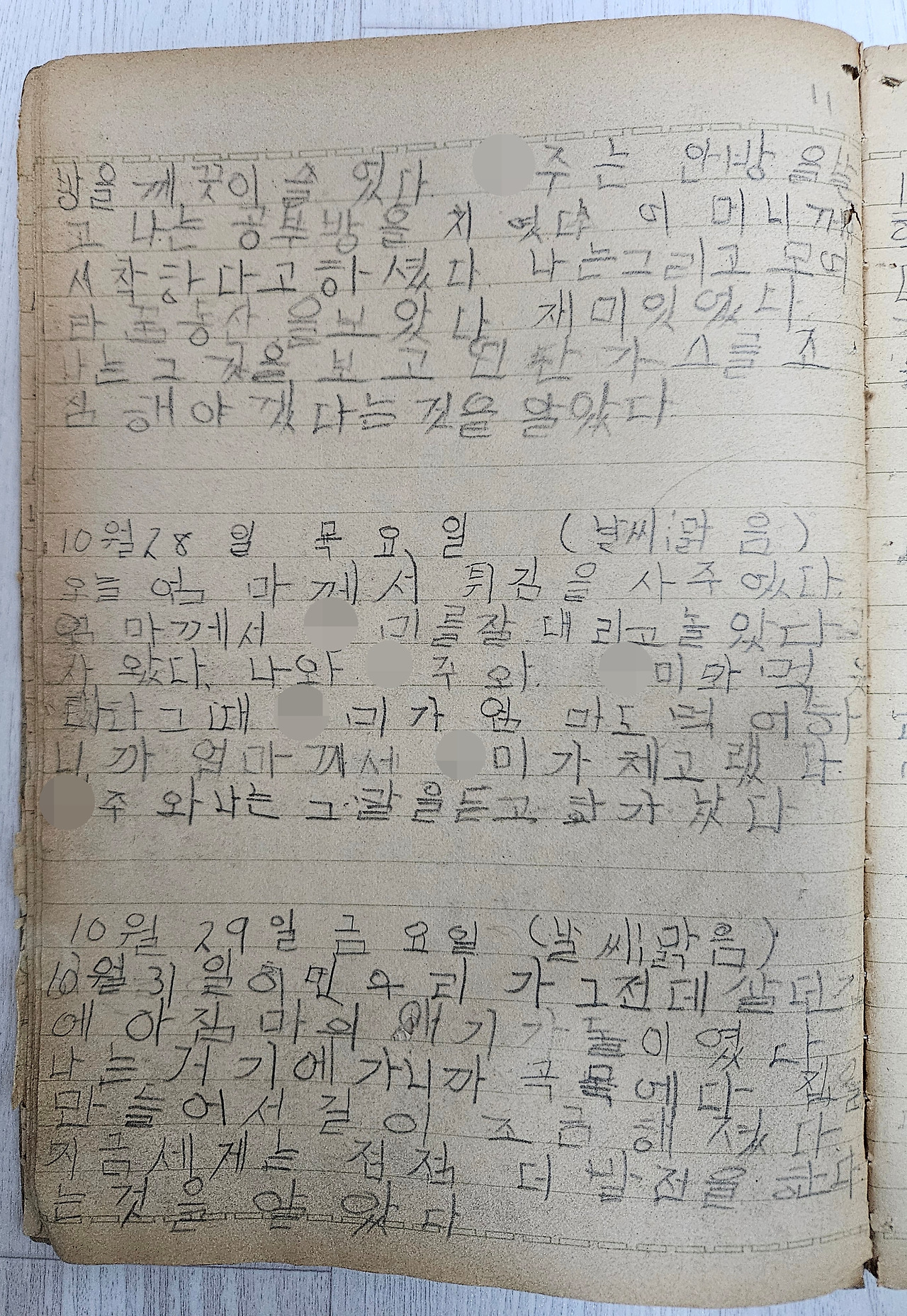 10월 31일이면 우리가 그전에 살던 집에 아줌마의 애기가 돌이었다. 나는 거기에 가니까 골목에다 집을 만들어서 길이 조금 해졌다. 지금 세계는 점점 더 발전을 한다는 것을 알았다.