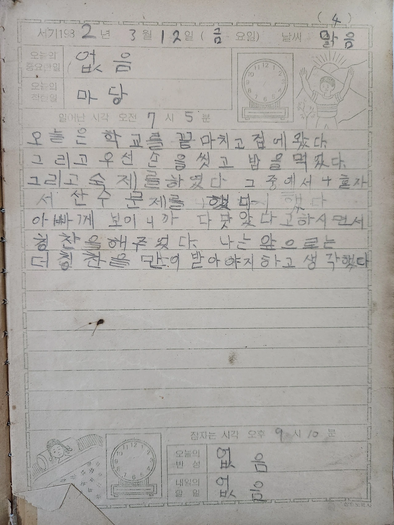 4학 때부터 도시락을 싸갔으니 집에 와서 밥을 먹었을 테고, 밥 먹기 전에는 손을 씻어야 한다는 걸 아는 모범생이었구나 싶다.