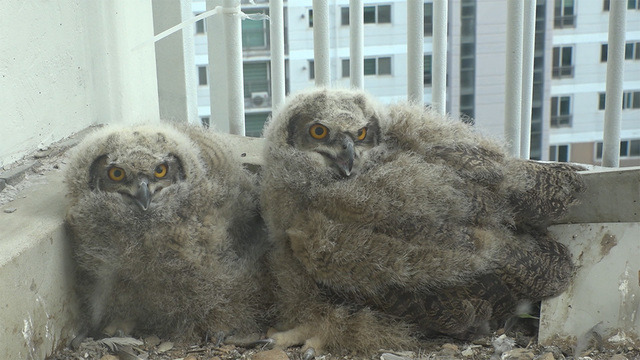 두 마리의 새끼 수리부엉이.