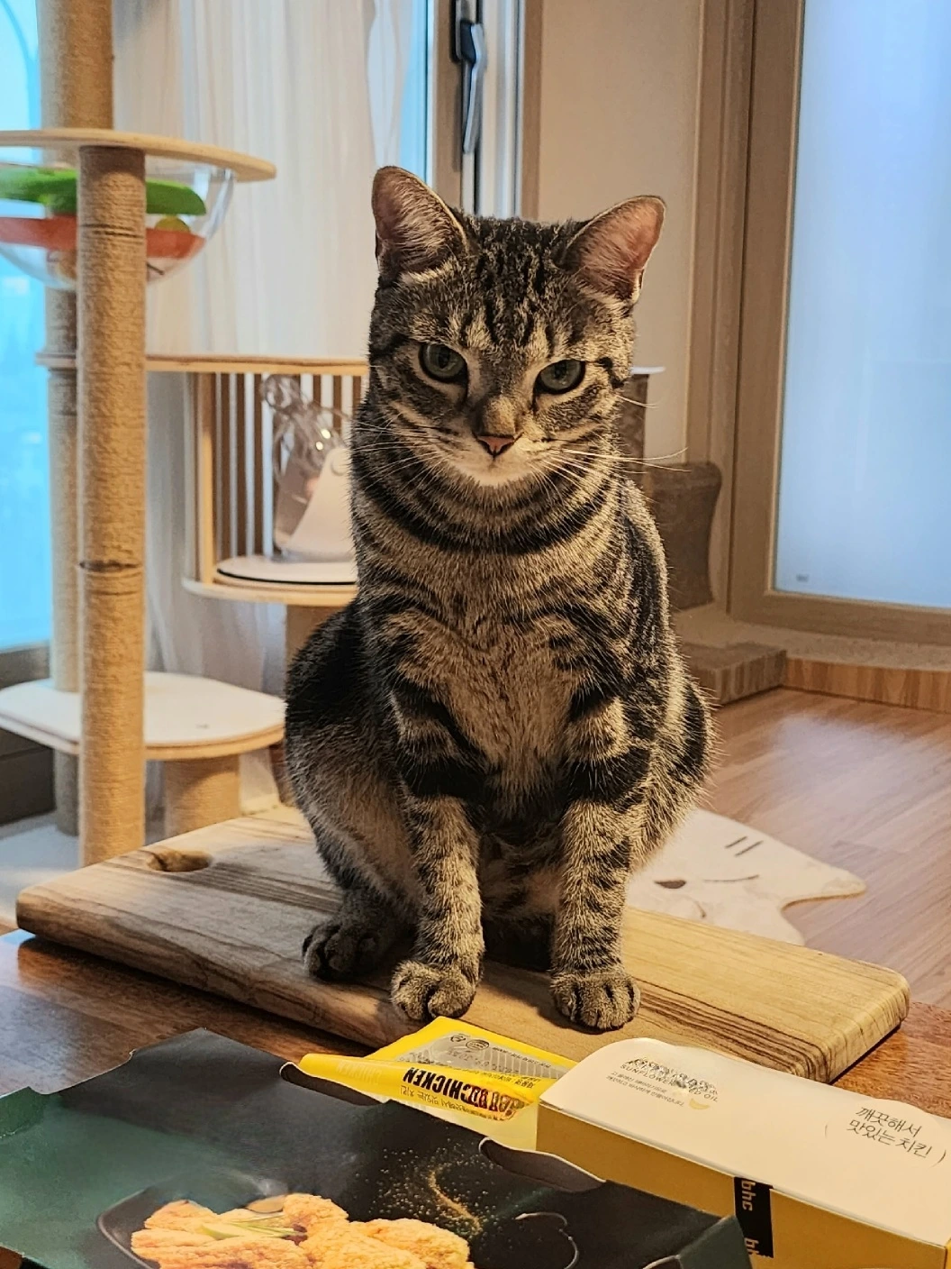 치킨을 먹는 내내, 테이블 위에서 시위하는 나무다.