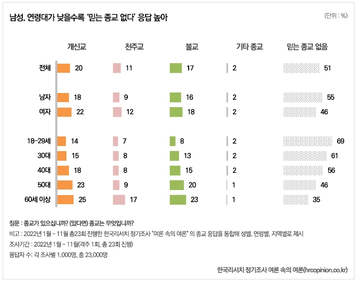 위의 연령, 성별에 따른 종교인구의 통계는 22년 한국리서치 여론조사 결과에서도 동일한 수치를 보여준다.