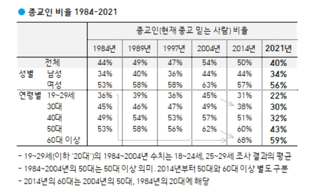 (또 다른 조사기관인 갤럽에 따르면 , 종교인 비중이 04년 54% → 14년 50% → 21년 40%, 감소추이로 조사되었다.)