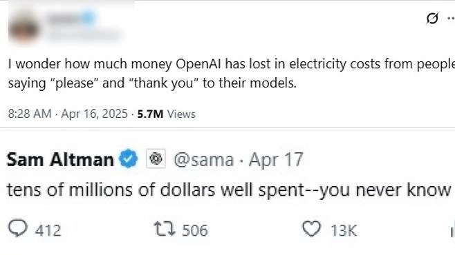 챗GPT의 사용자가 X(옛 트위터)를 통해 오픈AI CEO인 샘 알트먼에게 감사합니다라는 표현을 할 때 어느 정도의 전력소모가 더 되냐는 질문에 수천만 달러 수준이라는 답변을 했다는 내용이다.