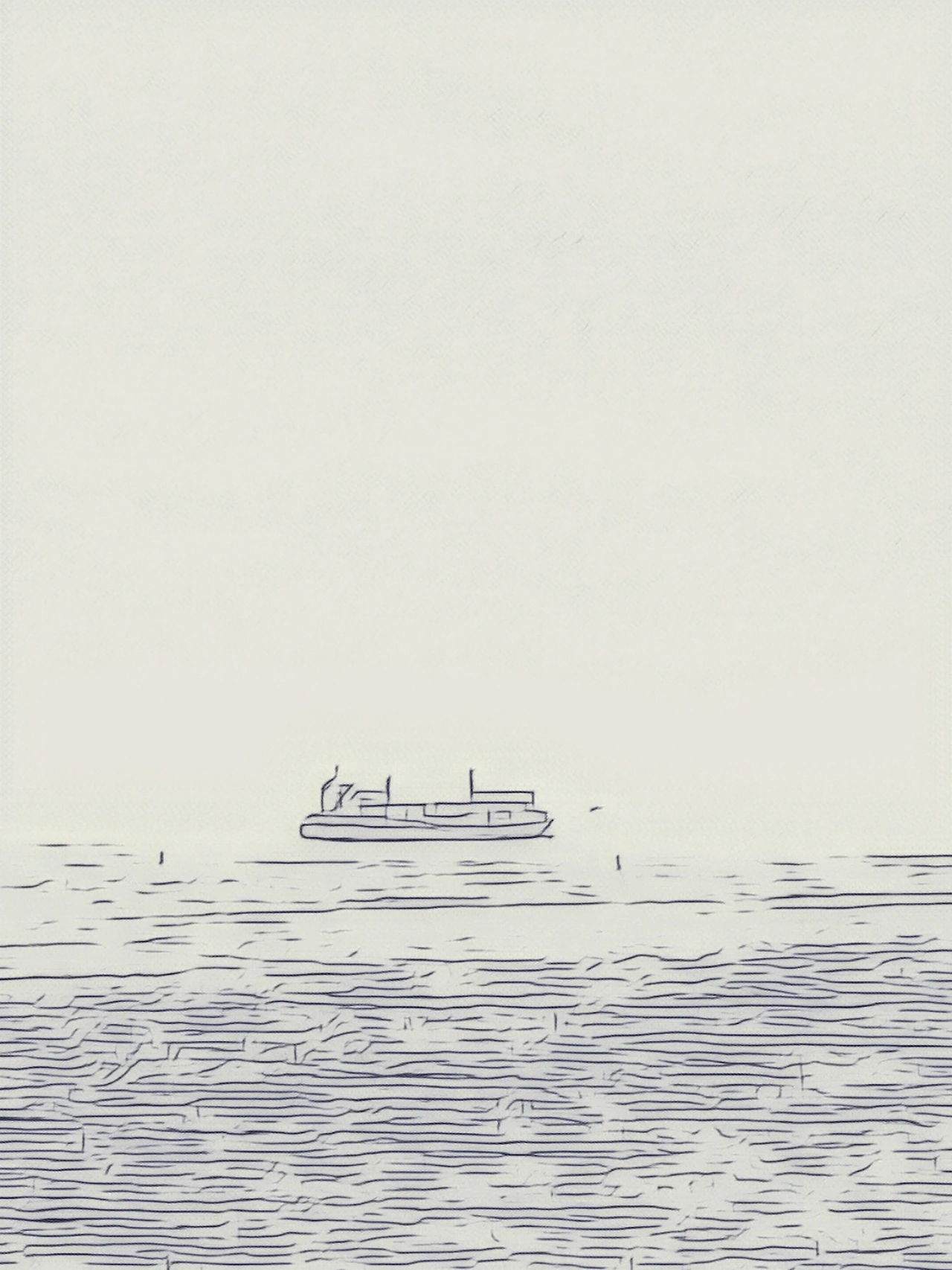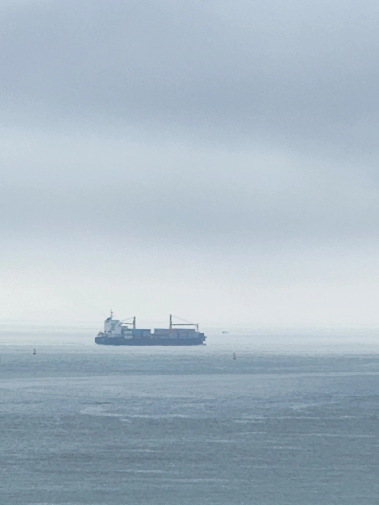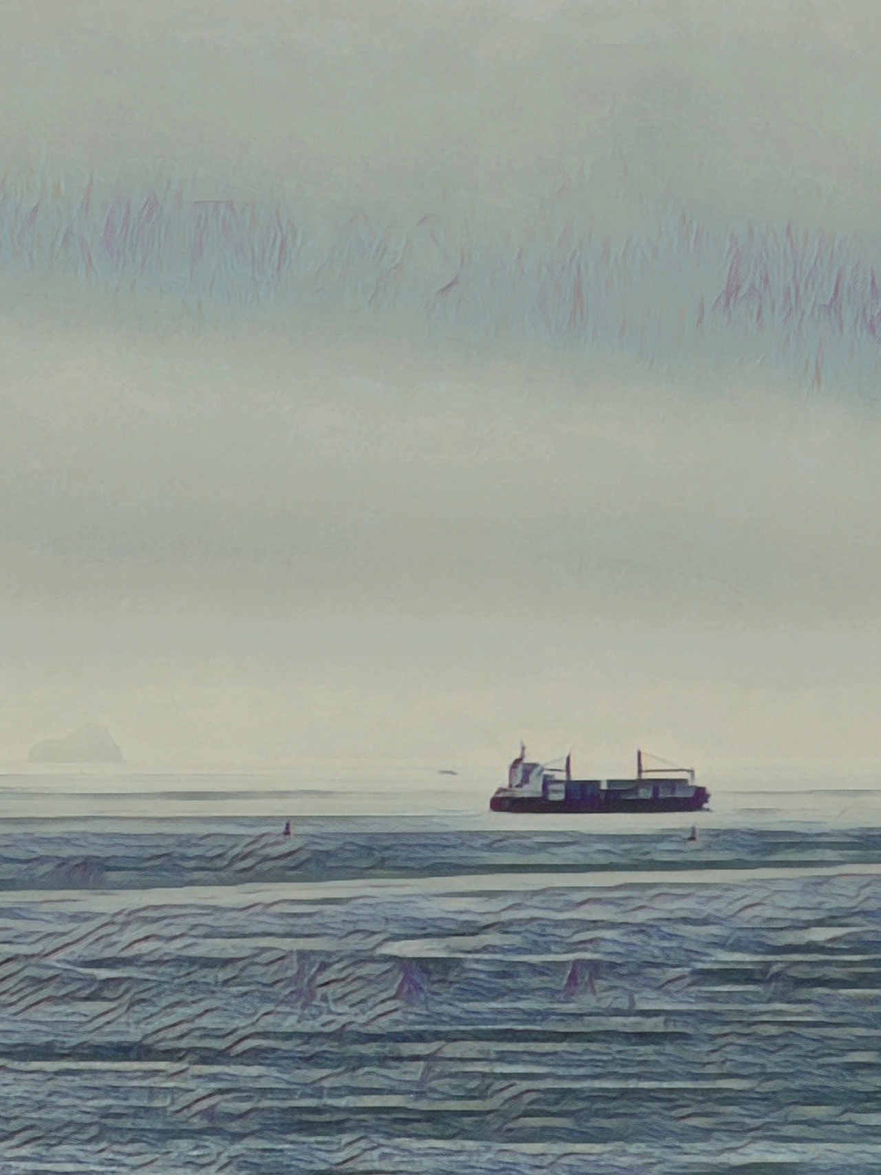 그러다가, 구름낀 하늘과 바다의 경계가 모호한 수평선에 지나가는 큰 배가 눈에 띄어 사진을 찍어본다.