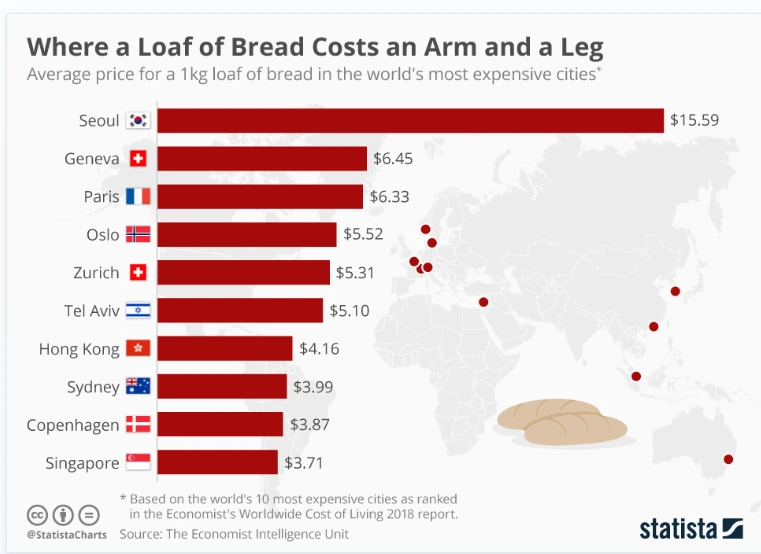 분명 자영업을 하시는 분들에게는 그 빵값 이어야 하는 이유가 있겠으나, 밀, 설탕, 우유, 버터를 등 주 원재료를 수입해서 사용하고, 인건비도 우리나라와 비슷하거나 더 비싼 나라보다도 두 배 넘게 비싼 빵값은 이해가 잘 안 되는 부분이다.