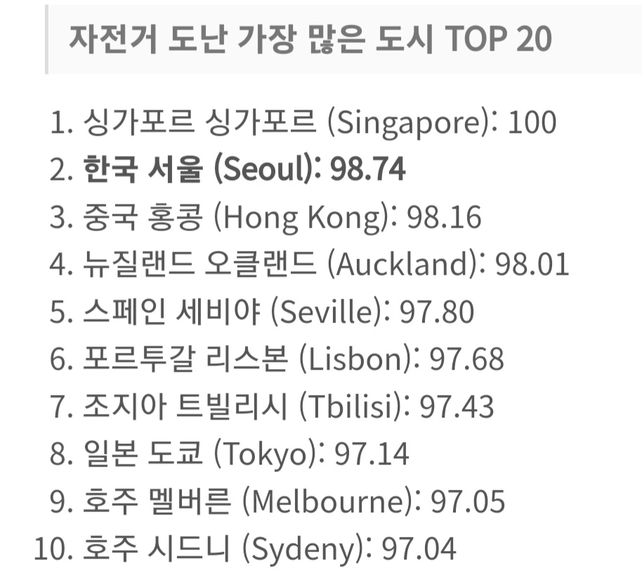사실 한국뿐만 아니라, 해외의 다른 나라도 자전거 도난율은 전반적으로 높다고 한다. 19년 자료이지만, 한 보험회사에서 발표한 글로벌 자전거 도시지수에 따르면 서울이 자전거 도난율 높은 도시 세계 2위라서 높은건 사실이다. 하지만, 다른 나라 역시 자전거는 도난맛집이다. 다만 한국은 카페의 빈테이블 위 지갑이나, 문 앞의 택배와 비교되어 더 화제가 되는 것 같다.