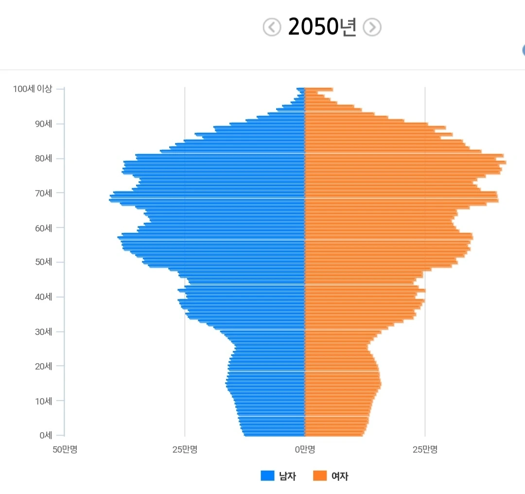 대략 30년 후인 2050년의 평균연령이 54.8세로 노령인구 비중은 어마어마 하다. 이런 상황에서 청년, 중년층의 소득과 세금만으로 노인복지를 버텨나갈 수 있을 것인가를 고려해 보면, 쉽지 않을 것 같다.