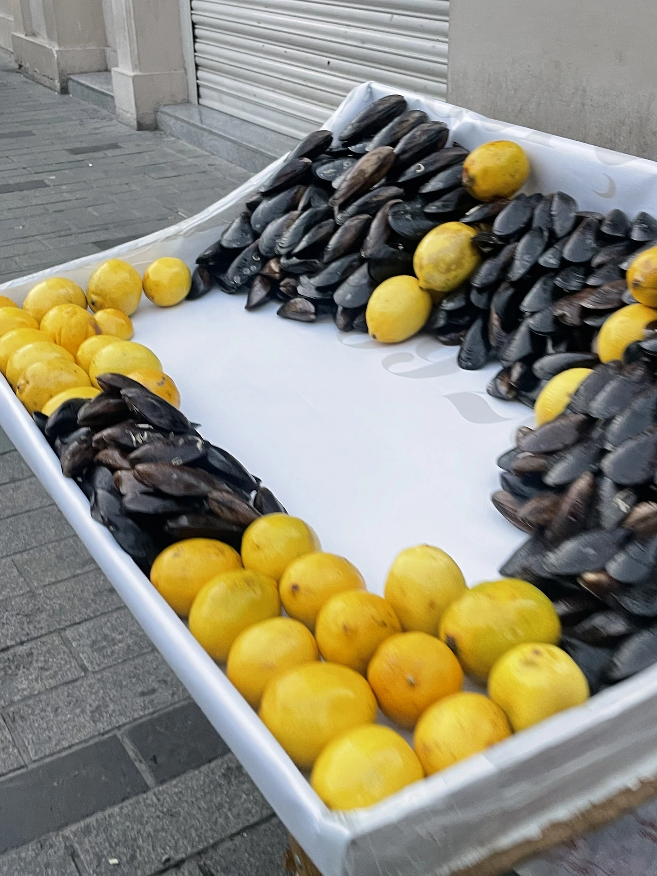 이스티클랄 거리를 걸었다. 담배 냄새가 코를 찌르던 그 거리. 이스탄불 탁심 광장. 나는 왜 이곳에 있을까? 아픈 허리를 부여잡고 갈라탑까지 걸었다. 상점들이 즐비한 거리는 각국의 청춘남녀들이 다 모인듯 했다. 빨간색 작은 트램엔 관광객들이 타고 있고 트램의 끝엔 개구쟁이 아이들이 곡예를 하듯 대롱대롱 매달려 있었다. 터키 아이스크림 아저씨의 묘기를 지켜보다 시선을 멀리 두니 모스크들이 보였다.거리를 걸으며 오래전 건축물들을 넌지시 보는 재미가 있었다. 튀르키예 길거리 음식인 ‘미르예 돌마‘(Midye Dolma)가 곳곳에 보였다. 레몬과 홍합의 조합이라니. 홍합을 먹고 탈이 난 기억이 나 사 먹고 싶진 않았다.