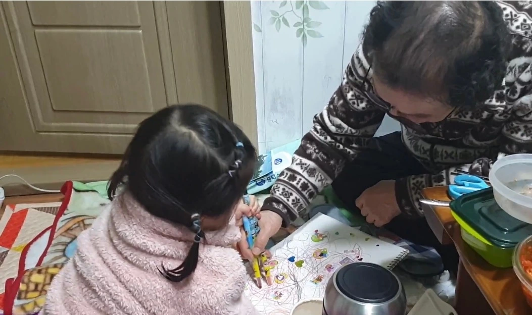“할아버지 이거 해보자.” 하며 색연필 두 자루를 합쳐 그걸 같이 쥐고 종이에 그림을 그리는 영상. 은유는 진지하고 그걸 보는 아빠는 연신 입꼬리를 씰룩 거리네요.