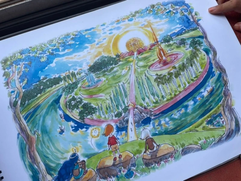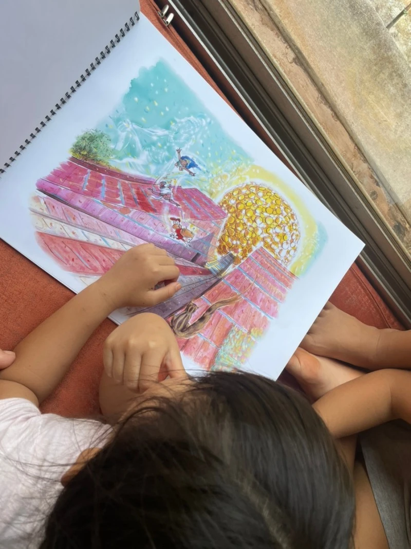 우연찮게 어제 오로빌 도서관에서 엠마뉴엘의 그림책 <불꽃섬의 보물>을 발견했는데, 그 책을 함께 읽으며 아이들에게 마트리만디르 이야기를 해 주었다.