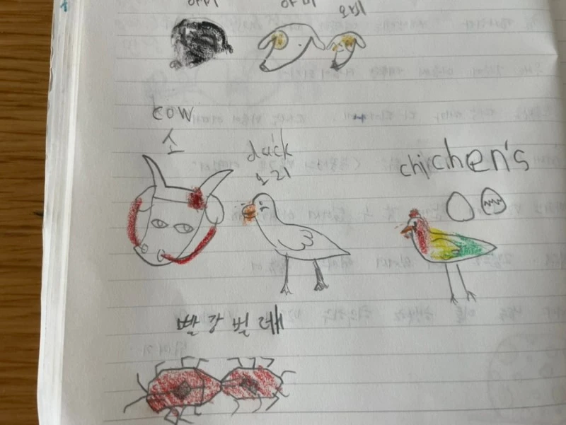 농장에서 함께 지낸 소와 개, 오리와 닭을 그린다. 색도 입힌다.